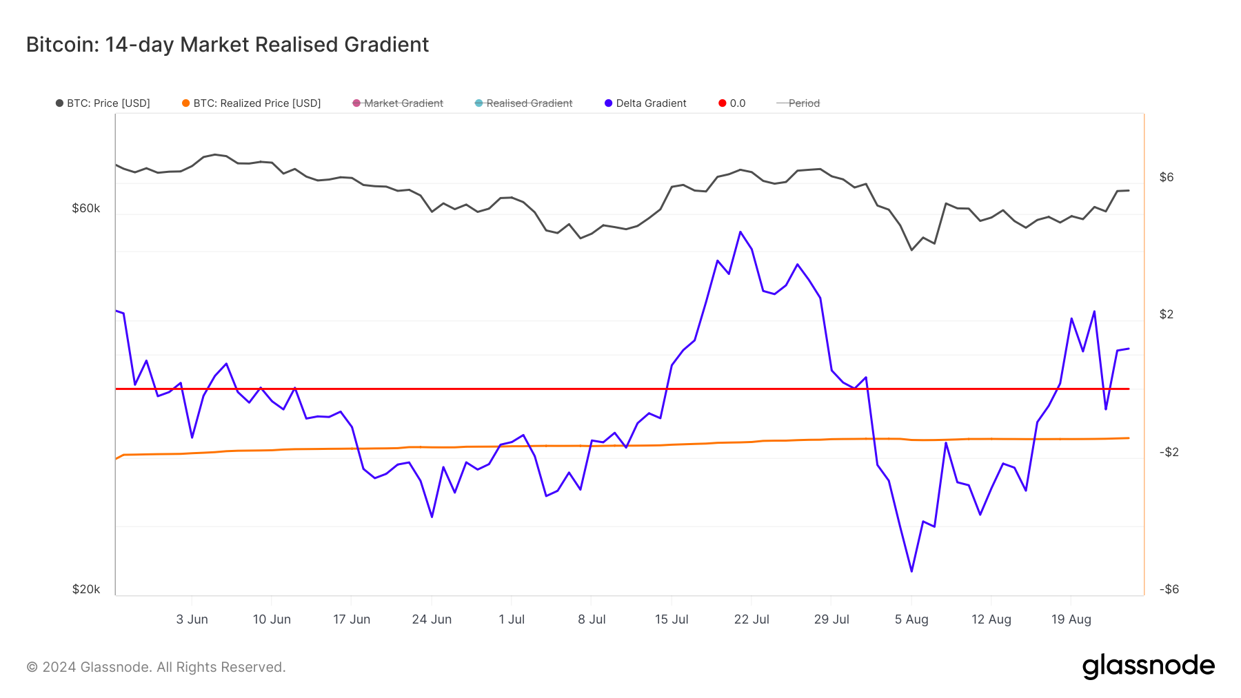 Glassnode-datan arvioinnin mukaan Bitcoinin 14 päivän markkina-toteutunut gradientti on 1,17. Tämä gradientti käyttää jokaisen kolikon viimeksi liikkuneen hinnan määrittämiseen odotetun nousu- tai laskutrendin pituutta.