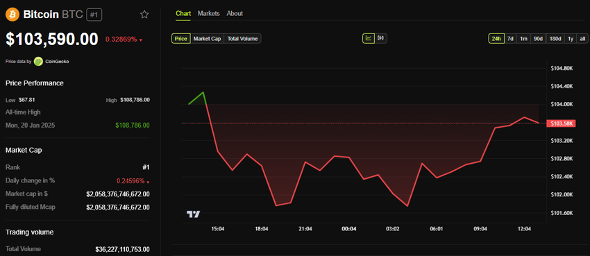 Välittömästi tämän jälkeen Bitcoinin hinta pysyi muuttumattomana, laskien 0,3 %. Tätä kirjoitettaessa se oli 103 590 dollaria.