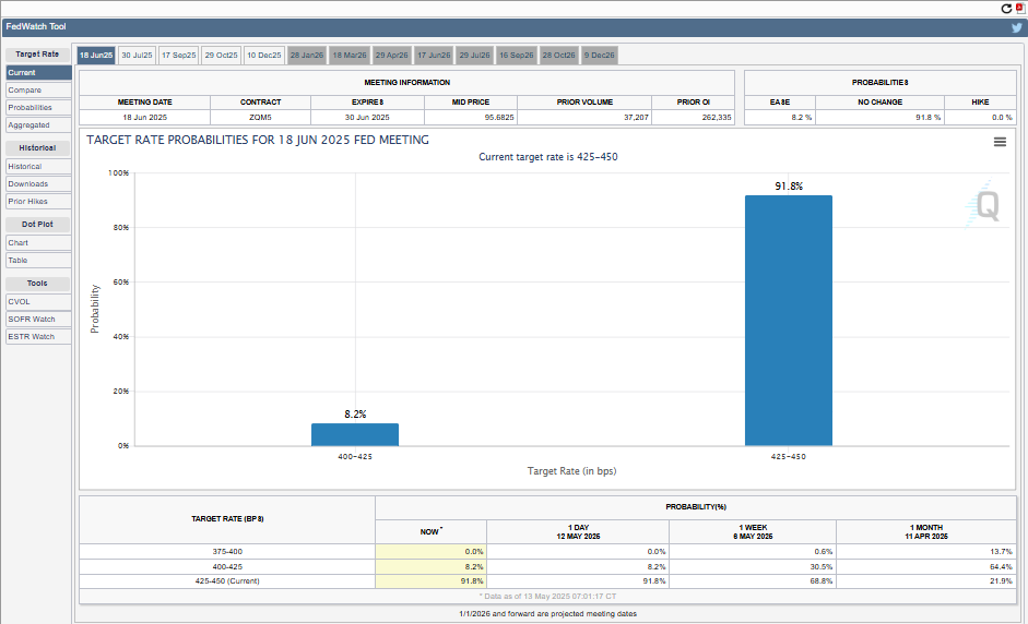 CPI-tietojen jälkeen CME FedWatch -työkalu osoittaa, että markkinat arvioivat 91,8 % todennäköisyyden koronlaskulle Fedin 18. kesäkuuta pidettävässä kokouksessa.