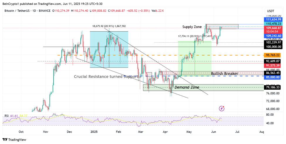 Tämä kaavio osoittaa, että Bitcoinin hinta konsolidoituu tarjonta-alueella 109 242 ja 111 634 dollaria välillä, kuten aiemmassa US Crypto News -julkaisussa todettiin.