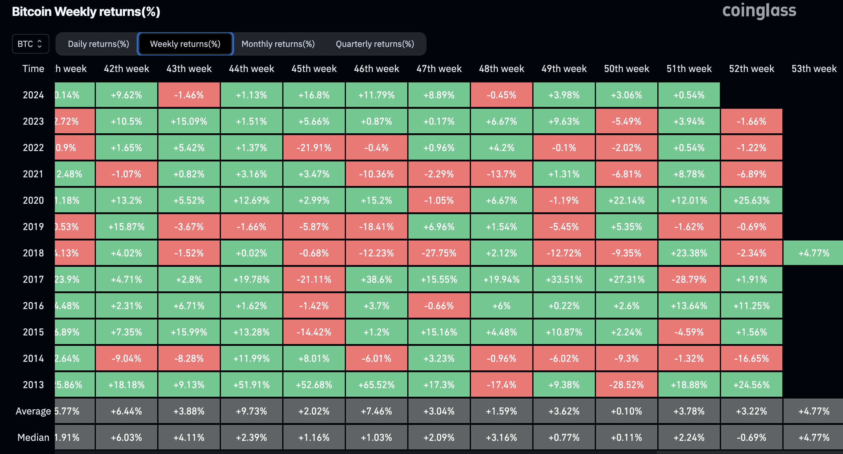 Coinglassin tiedot osoittavat, että vuonna 2020 halving-vuonna Bitcoin nousi 25,63 % joulun viikolla (52. viikko). Samoin vuonna 2016 BTC nousi 11,25 %, ja vuonna 2012 se kirjasi toisen kaksinumeroisen nousun.