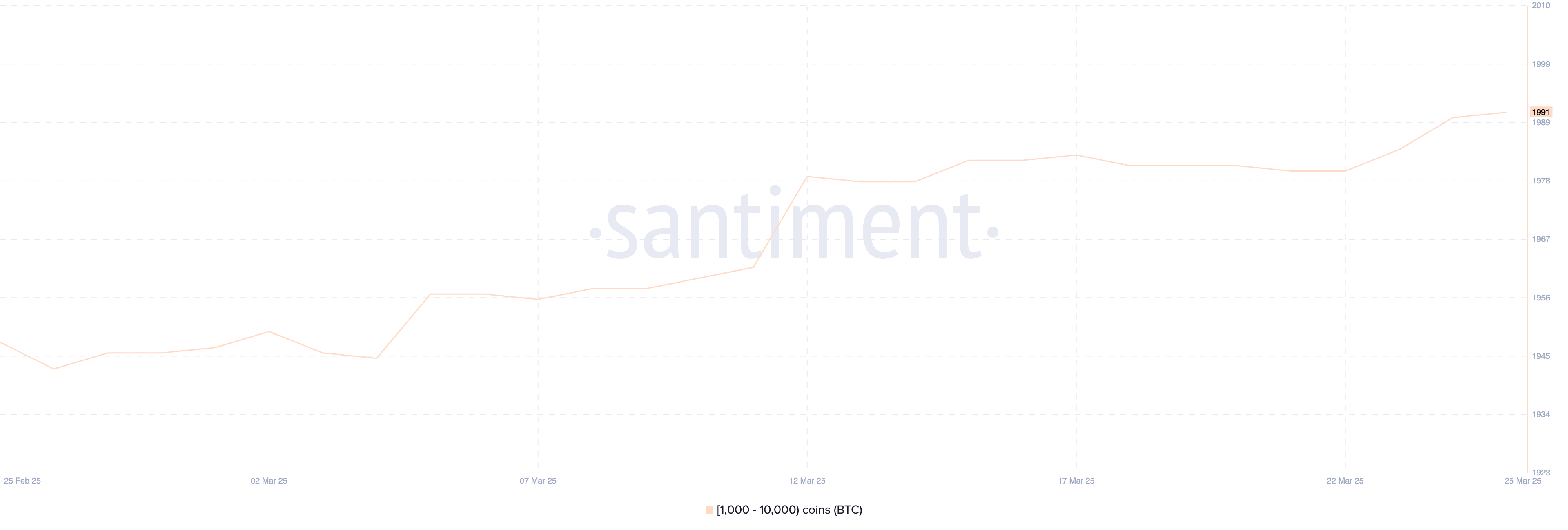 Bitcoin-valaiden—lompakot, jotka sisältävät 1 000–10 000 BTC:tä—määrä kasvoi 1 980:sta 22. maaliskuuta 1 991:een 25. maaliskuuta, mikä on korkein määrä sitten 15. joulukuuta.