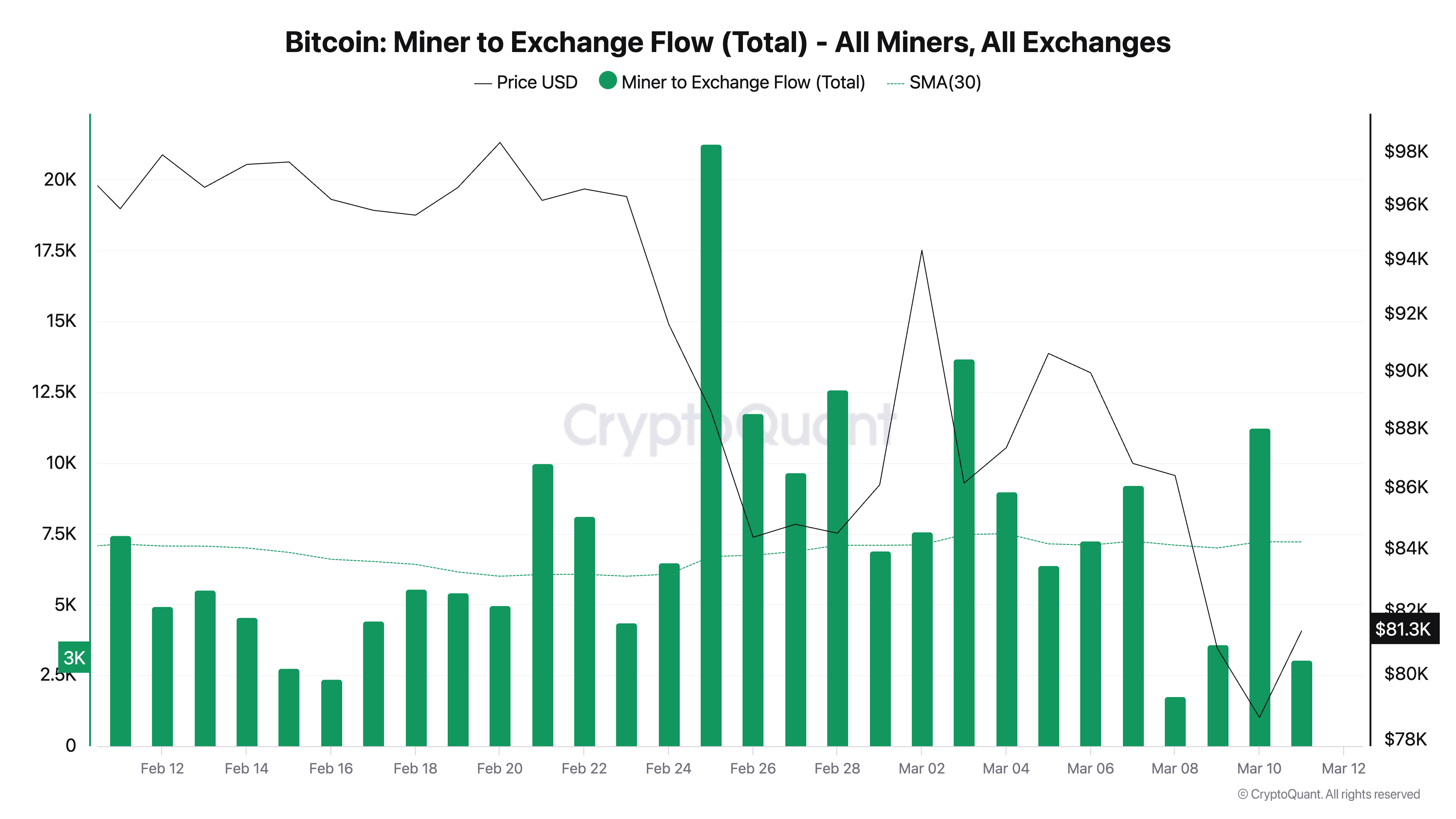 Kun Bitcoin putosi monen kuukauden alhaisimmalle tasolle maanantaina, louhijoiden siirrot pörsseihin kasvoivat jyrkästi. CryptoQuantin mukaan BTC:n Miner-to-Exchange Flow—joka mittaa louhijalompakoista pörsseihin lähetettyjen kolikoiden kokonaismäärää—nousi 11 250 BTC:hen tänä aikana.