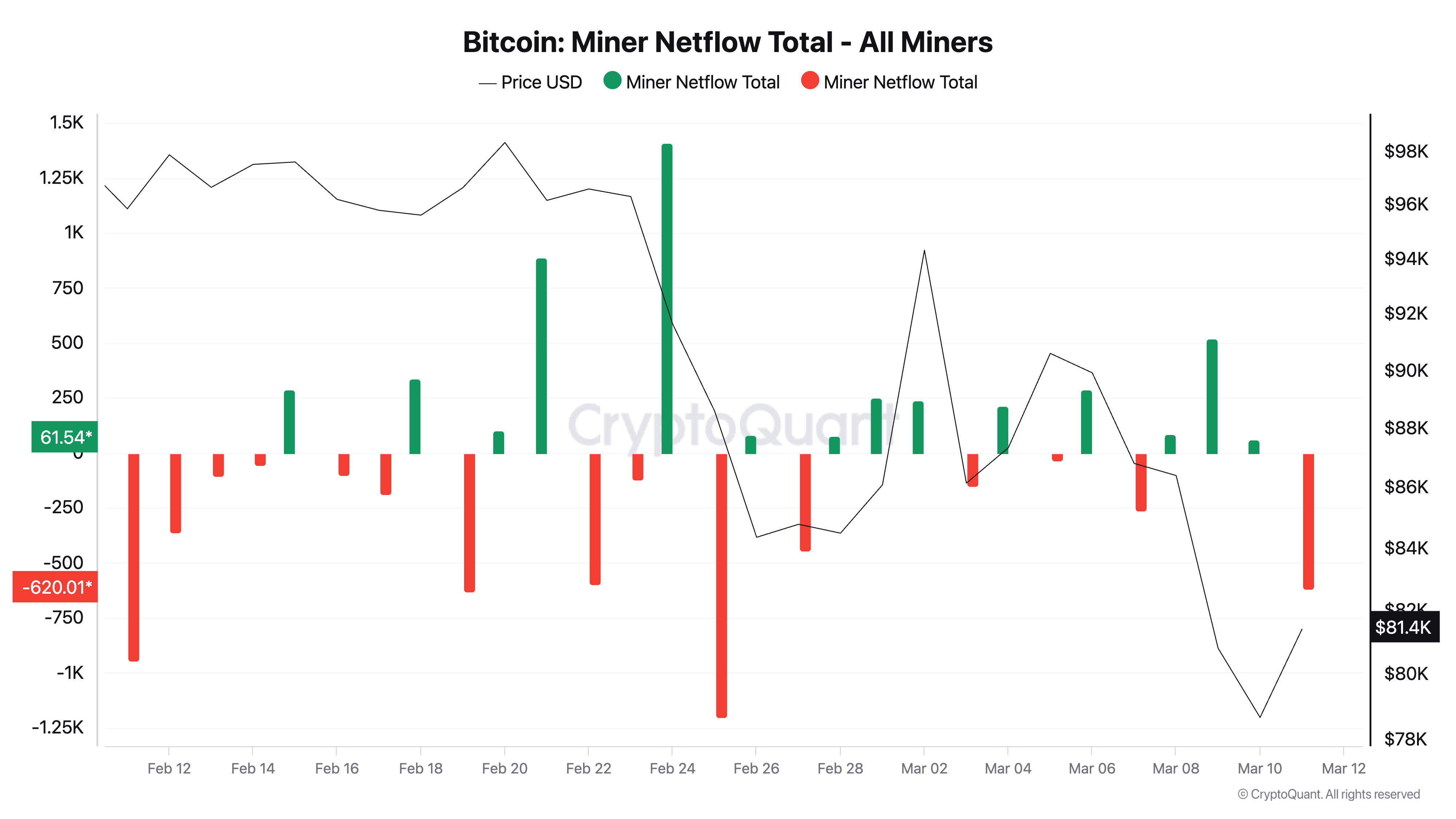 Louhijoiden nettovirta seuraa kolikoiden nettomäärää, joita louhijat ostavat tai myyvät. Se lasketaan vähentämällä louhijoiden myymien BTC-kolikoiden määrä ostettujen määrästä.