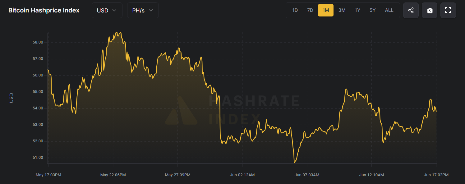 Hashraten kasvu vahvistaa verkkoa, mutta sillä on hintansa. Hashprice — tunnusluku, joka mittaa, kuinka paljon louhija voi ansaita hashrate-yksikköä kohden — on pudonnut vain 52 dollariin per PH/s.