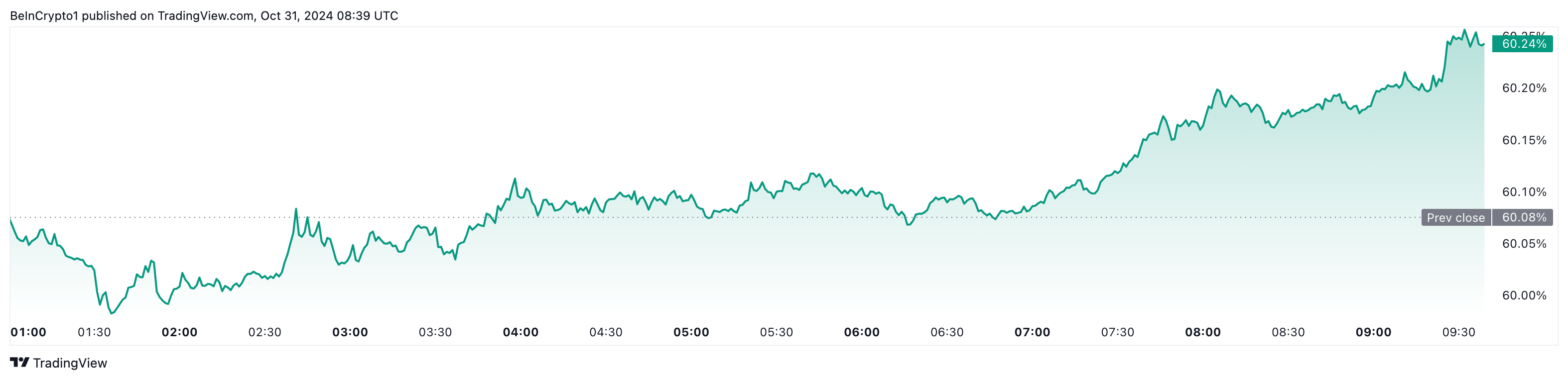 Toinen tekijä, joka saattaa vaikuttaa Bitcoinin marraskuun 2024 hintasuoritukseen, on sen hallitsevuus. Tätä kirjoitettaessa Bitcoinin hallitsevuus on noussut 60 %:iin.