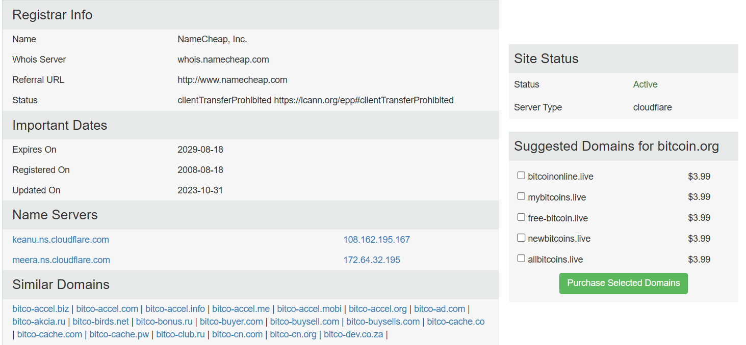 Bitcoin.orgin rekisteröintitiedot. Lähde: who.is