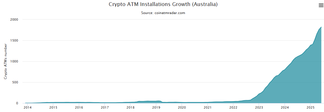 CoinATMRadarin tietojen mukaan kryptoautomaattien määrä Australiassa on noussut huimasti. Se kasvoi vain 40 koneesta vuonna 2022 yli 1 800:aan vuoteen 2025 mennessä.