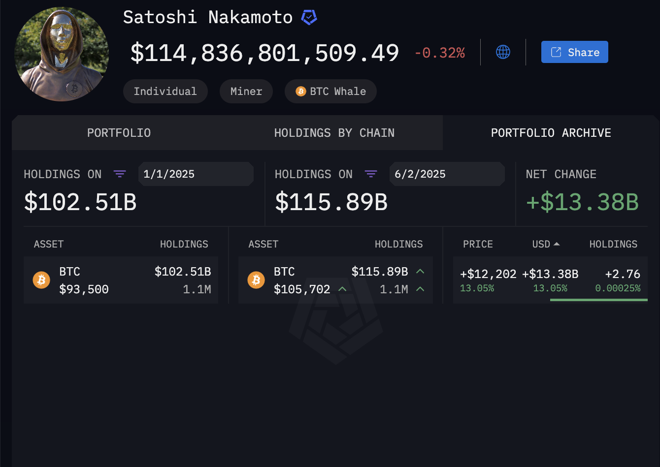 Samaan aikaan Satoshin omat Bitcoin-omistukset kasvavat vain, mikä takaa hänen nettovarallisuutensa nousun.