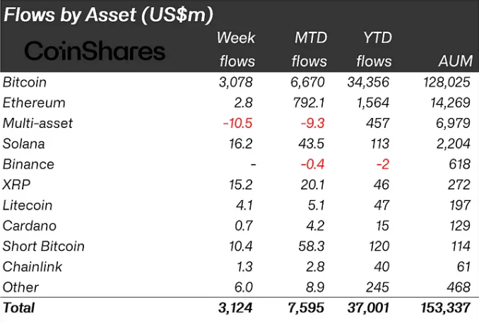 Bitcoin johti joukkoa 3,078 miljardin dollarin sijoituksilla viime viikolla, mikä merkitsi sen vahvinta suoritusta tähän mennessä. Huolimatta kaikkien aikojen hintahuippujen saavuttamisesta, kiinnostus laajeni myös short-Bitcoin-sijoitustuotteisiin, jotka kirjauttivat 10 miljoonan dollarin viikoittaiset sijoitukset. Erityisesti nämä short-Bitcoin-sijoitukset nousivat 58 miljoonaan dollariin kuukaudessa — korkein elokuusta 2022 lähtien.