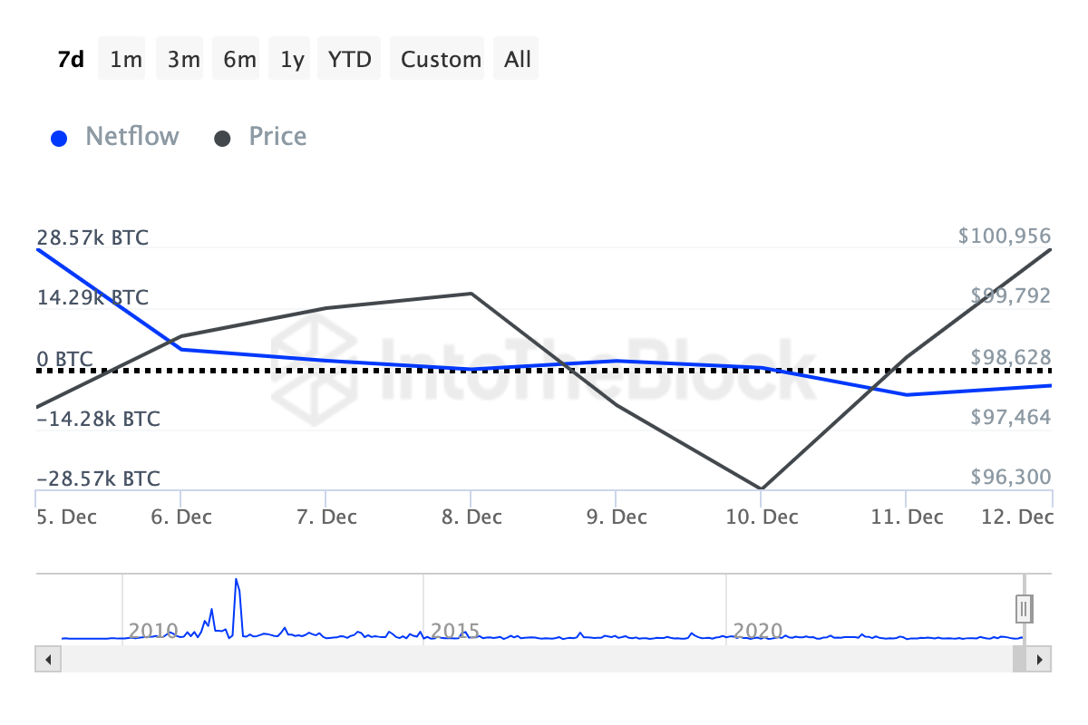 IntoTheBlockin tiedot paljastavat, että Bitcoinin suurten haltijoiden nettovirta — tunnusluku, joka seuraa yli 1 % liikkeessä olevasta tarjonnasta hallussaan pitävien osoitteiden nettomyyntiä tai -ostoa — on osoittanut merkittäviä muutoksia viime viikolla. Viikko sitten nettovirta oli 28 570 BTC, kun Bitcoinin hinta oli 97 885 dollaria.