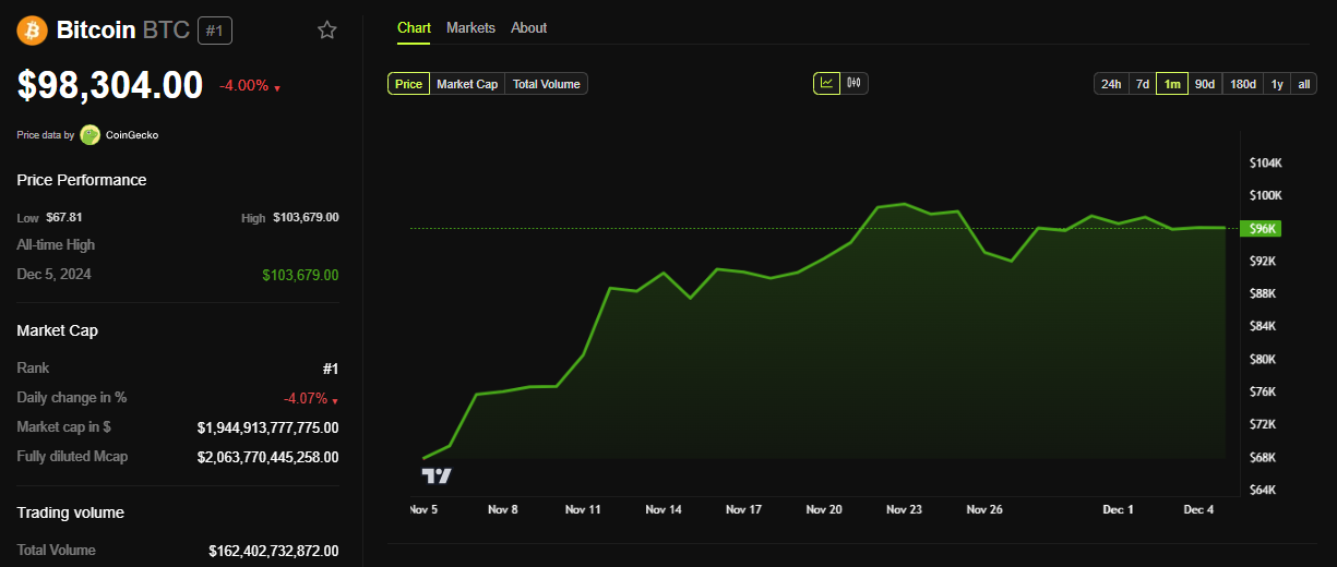 BeInCrypto tietojen mukaan Bitcoinin hinta oli 98 404 dollaria tätä kirjoitettaessa, mikä edustaa 4 %:n laskua perjantain session avautumisesta.