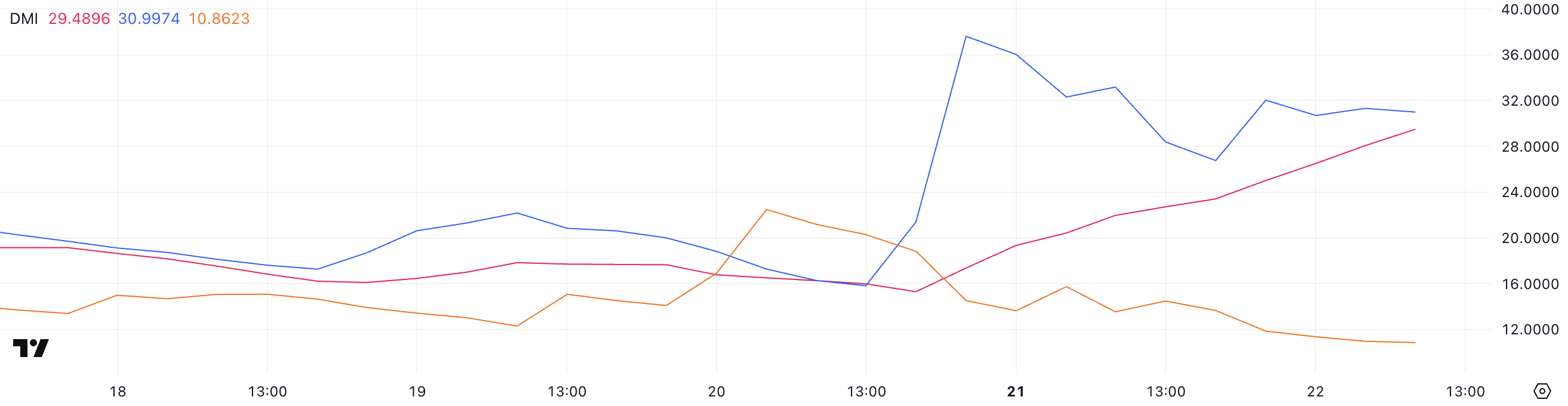 Tarkasteltaessa DMI-komponentteja syvällisemmin, +DI (positiivinen suuntain) on tällä hetkellä 30,99 — lähes kaksinkertaistunut 15,82:sta kaksi päivää sitten, vaikka hieman laskenut eilisestä 37,61 huipusta.