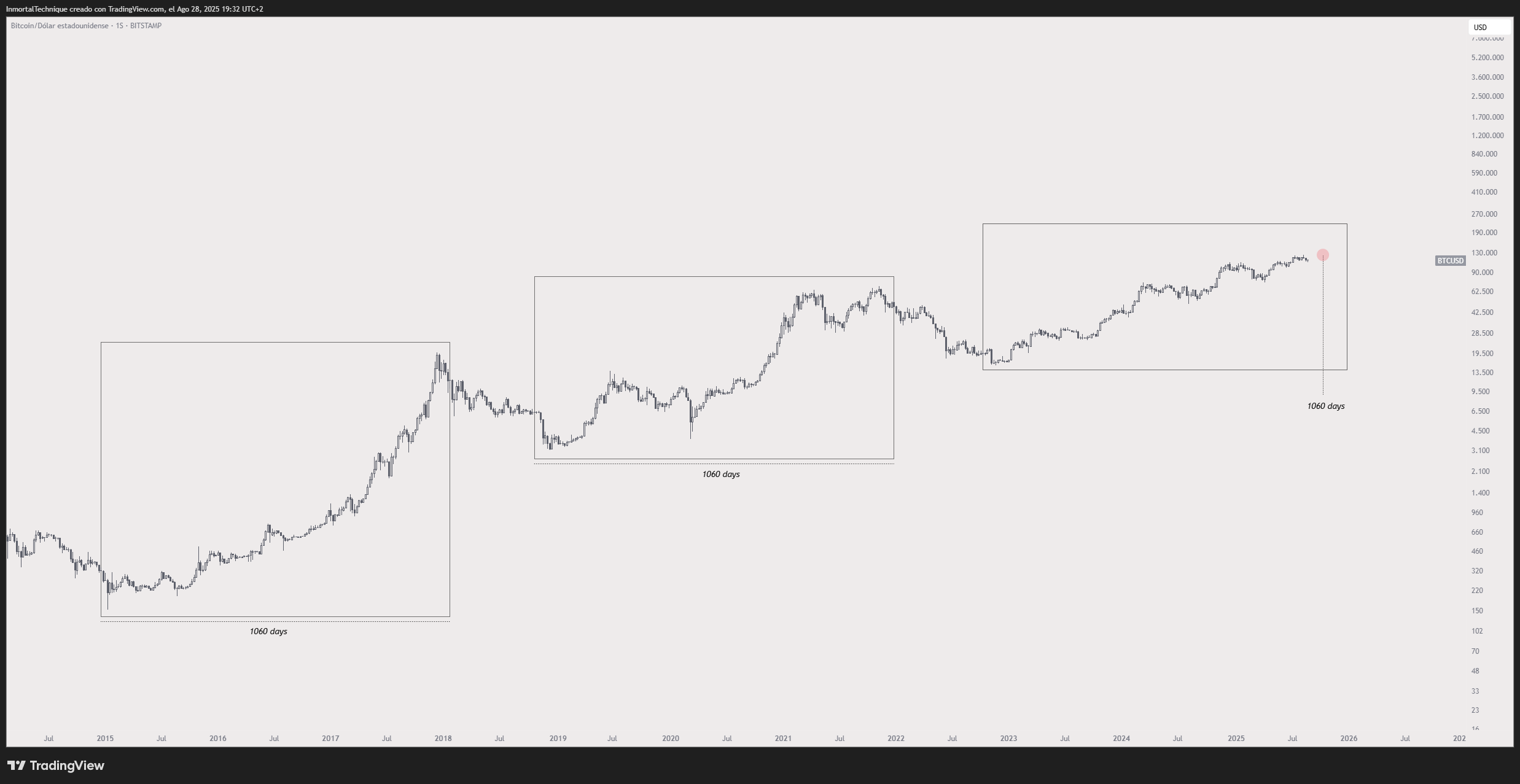 Analyytikko Inmortal jakoi X:ssä, että jokainen aiempi härkäsylki kesti noin 1 060 päivää. Hänen kaavionsa korosti syklien samankaltaisuuksia, ja laatikot merkitsivät 1 060 päivän jaksoja pohjasta huippuun.