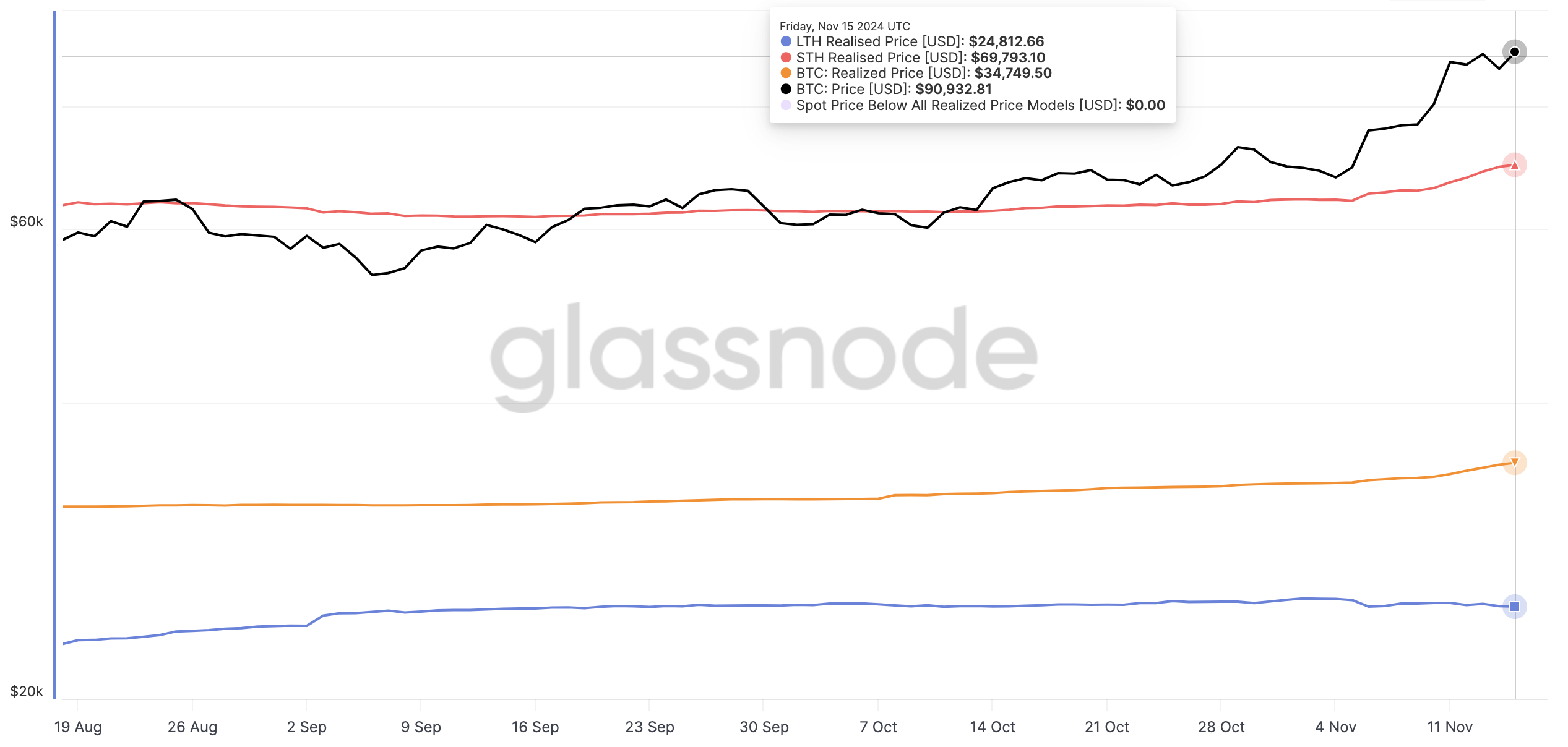 Lisäksi Glassnoden tiedot osoittavat, että Bitcoin käy tällä hetkellä kauppaa Lyhytaikaisten (STH) ja Pitkäaikaisten (LTH) haltijoiden toteutuneen hinnan yläpuolella. Toteutunut hinta edustaa markkinaosallistujien kolikoista maksamaa tarjontapainotteista keskihintaa. Se toimii on-chain-indikaattorina mahdollisista tukitasoista tai vastustasoista.