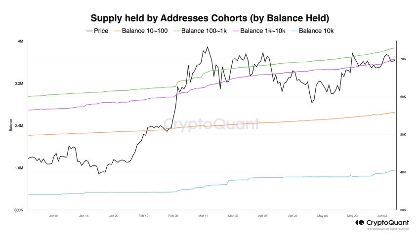 Erityisesti osoitteet, joissa oli 100–1 000 BTC:tä, kasvoivat 30 601 BTC:tä, 1 000–10 000 BTC:tä omistavat 34 834 BTC:tä ja suurimmat haltijat, yli 10 000 BTC:tä omistavat, kasvattivat saldojaan 24 176 BTC:llä.