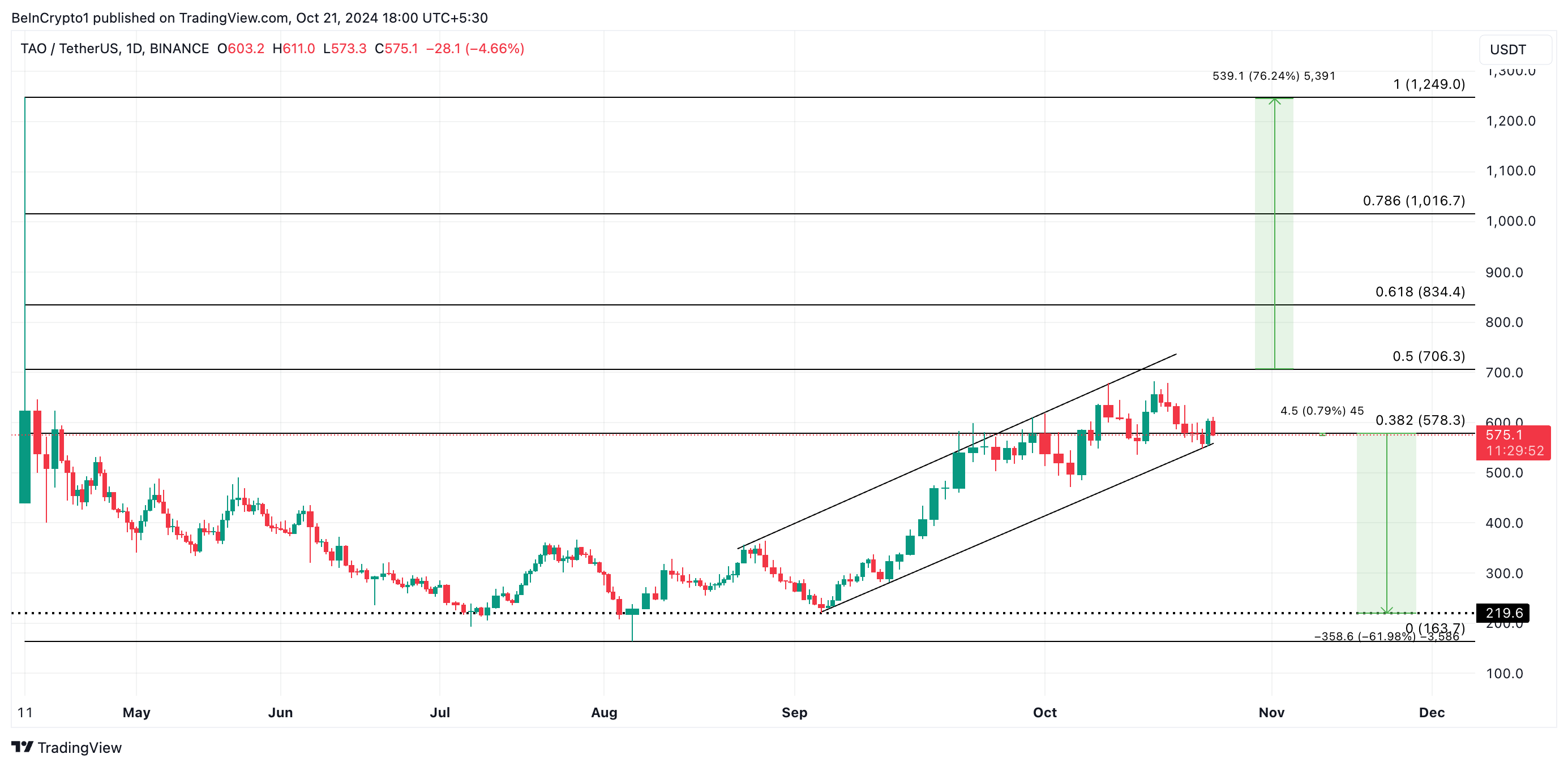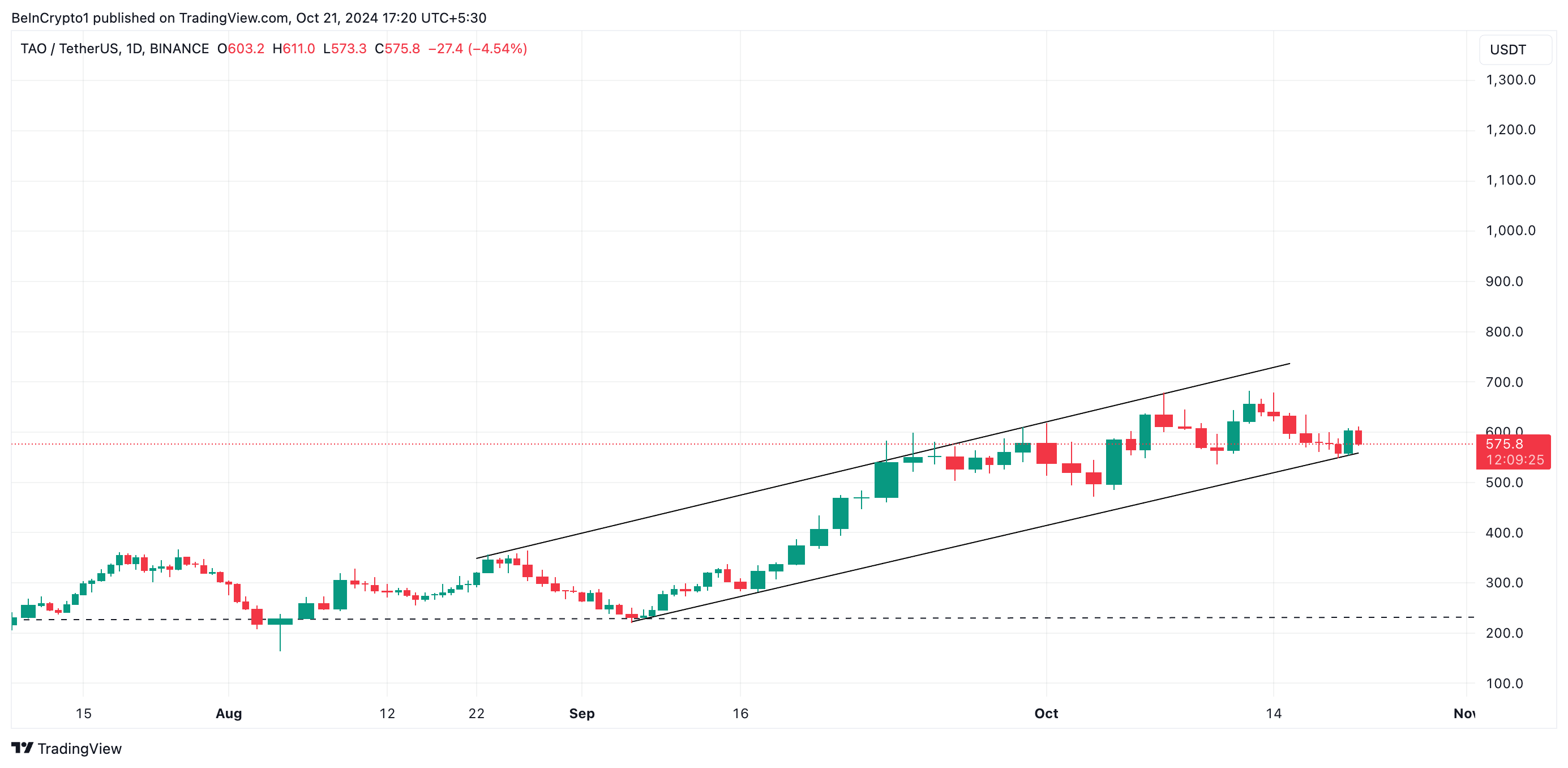 Johtavan tekoälyyn liittyvän tokenin Bittensorin (TAO) hinta on seurannut nousevaa kanavaa syyskuun alusta lähtien. Tätä kirjoitettaessa sen hinta on 575 dollaria, ja altcoin on sittemmin kokenut 150 %:n nousun.