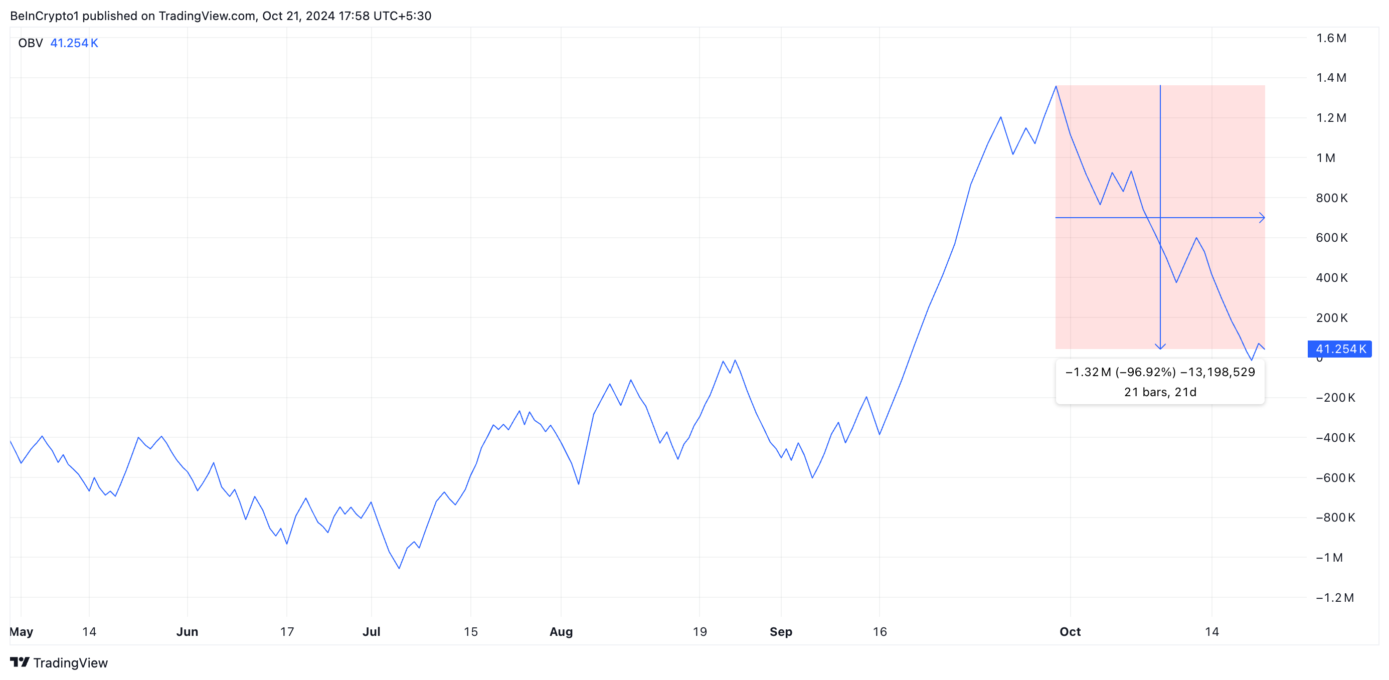 Lisäksi TAO:n laskeva on-balance volume (OBV) tukee tätä karhua näkemystä. Se on 41,254 lehdistöhetkellä, huomaten 97 % laskun viimeisen 21 päivän aikana.