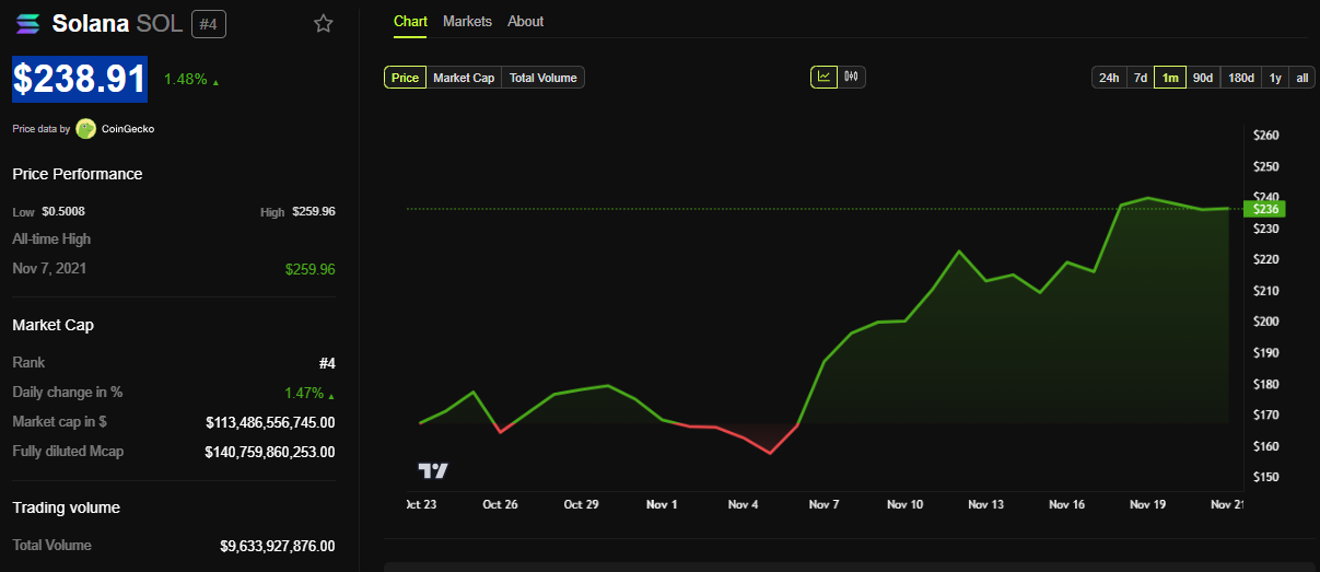 BeInCrypto-tietojen mukaan Solanan tokenin hinta on noussut vaatimattomasti 1,48 % tämän uutisen myötä. Tätä kirjoitettaessa SOL:n hinta on 238,91 dollaria.