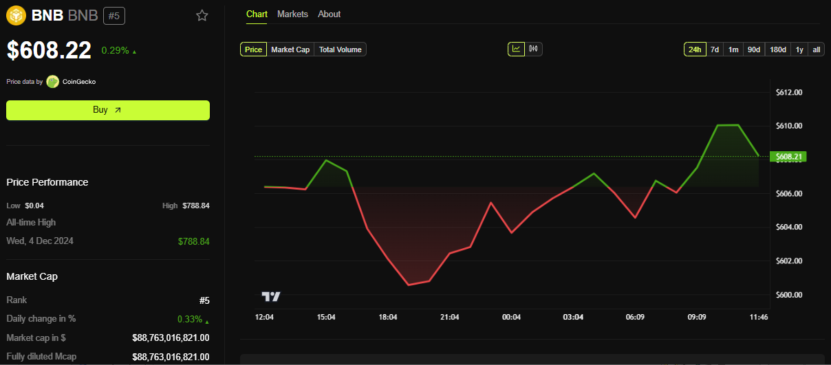 BNB:n hinta on noussut vaatimattomasti 0,29 % viimeisen 24 tunnin aikana. Tätä kirjoitettaessa se oli 608,22 dollaria.