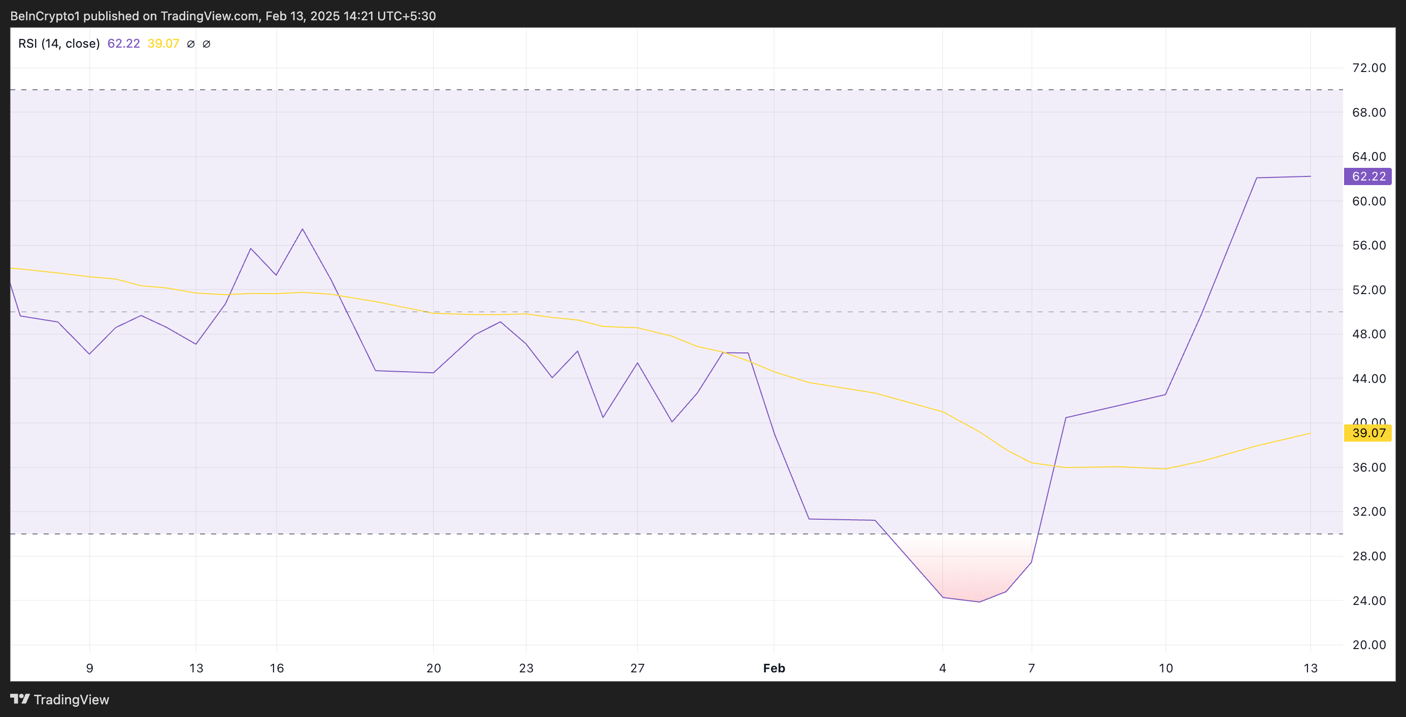 Arvolla 62,22 BNB:n RSI osoittaa, että se on nousualueella, mutta ei vielä yliostettu. Tämä viittaa vahvaan ostotunnelmaan, jossa on tilaa lisänousulle.
