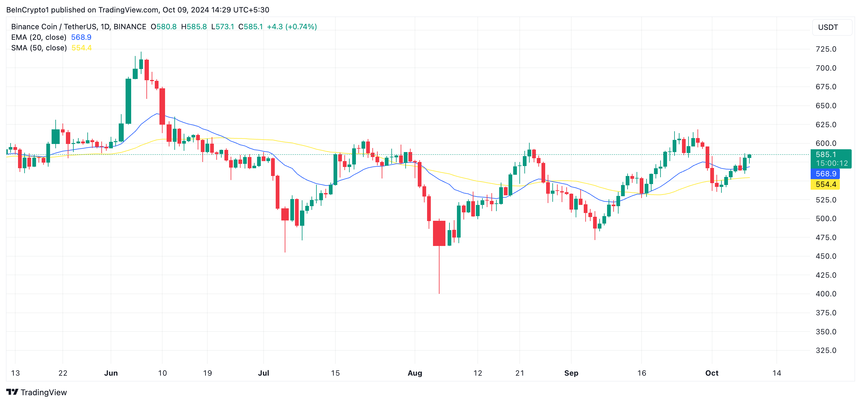Nykyisellä hinnallaan BNB käy kauppaa yli 20 päivän eksponentiaalisen liukuvan keskiarvon (EMA) ja 50 päivän pienen liukuvan keskiarvon (SMA) yläpuolella.