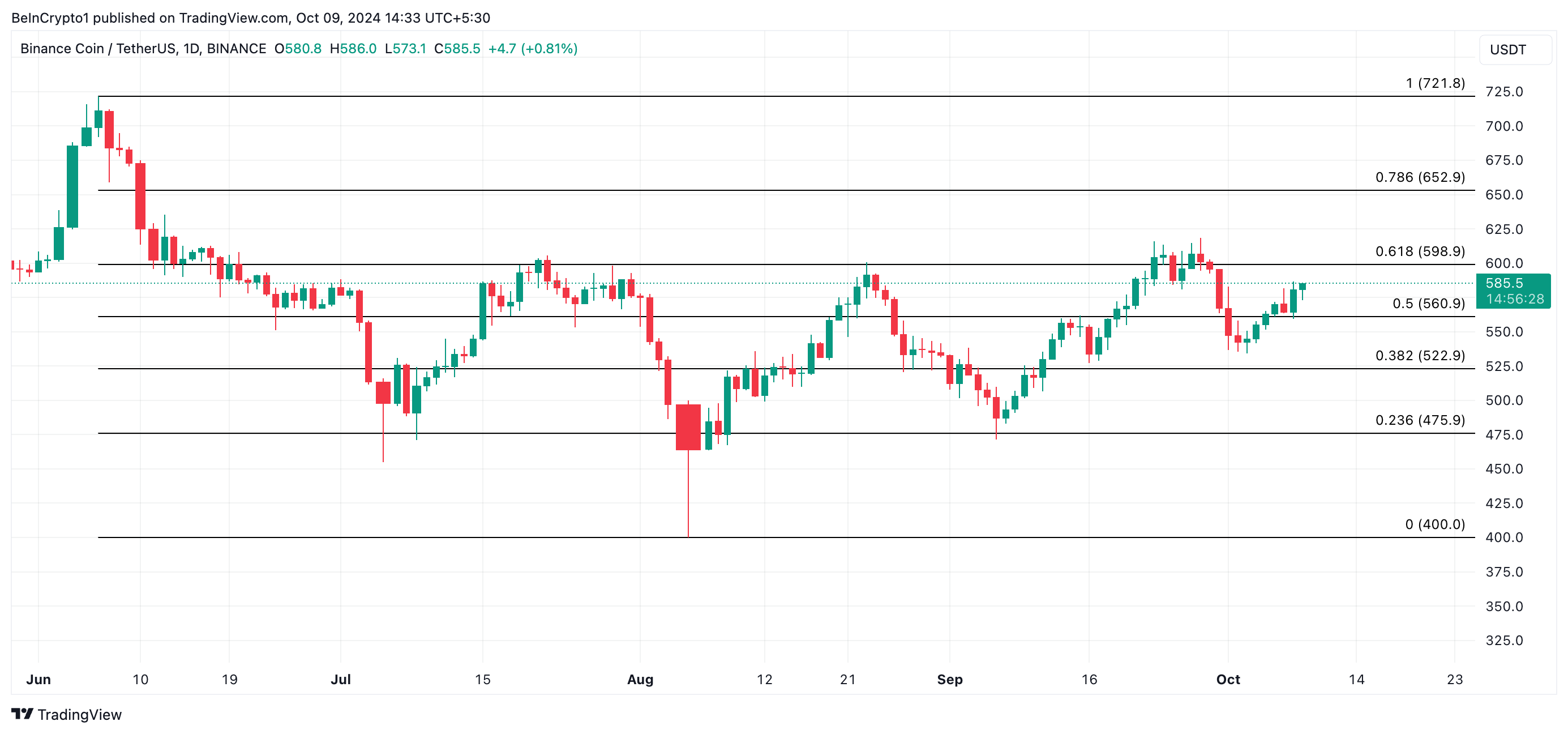 BNB on saavuttanut 5 %:n nousun viime viikon aikana, lähestyen pitkän aikavälin vastustustasoaan 598,90 dollaria. Tätä kirjoitettaessa altcoin käy kauppaa seitsemän päivän korkeimmalla hinnalla 585,50 dollaria, ja näyttää valmiilta jatkamaan ylöspäin suuntautuvaa liikettään.