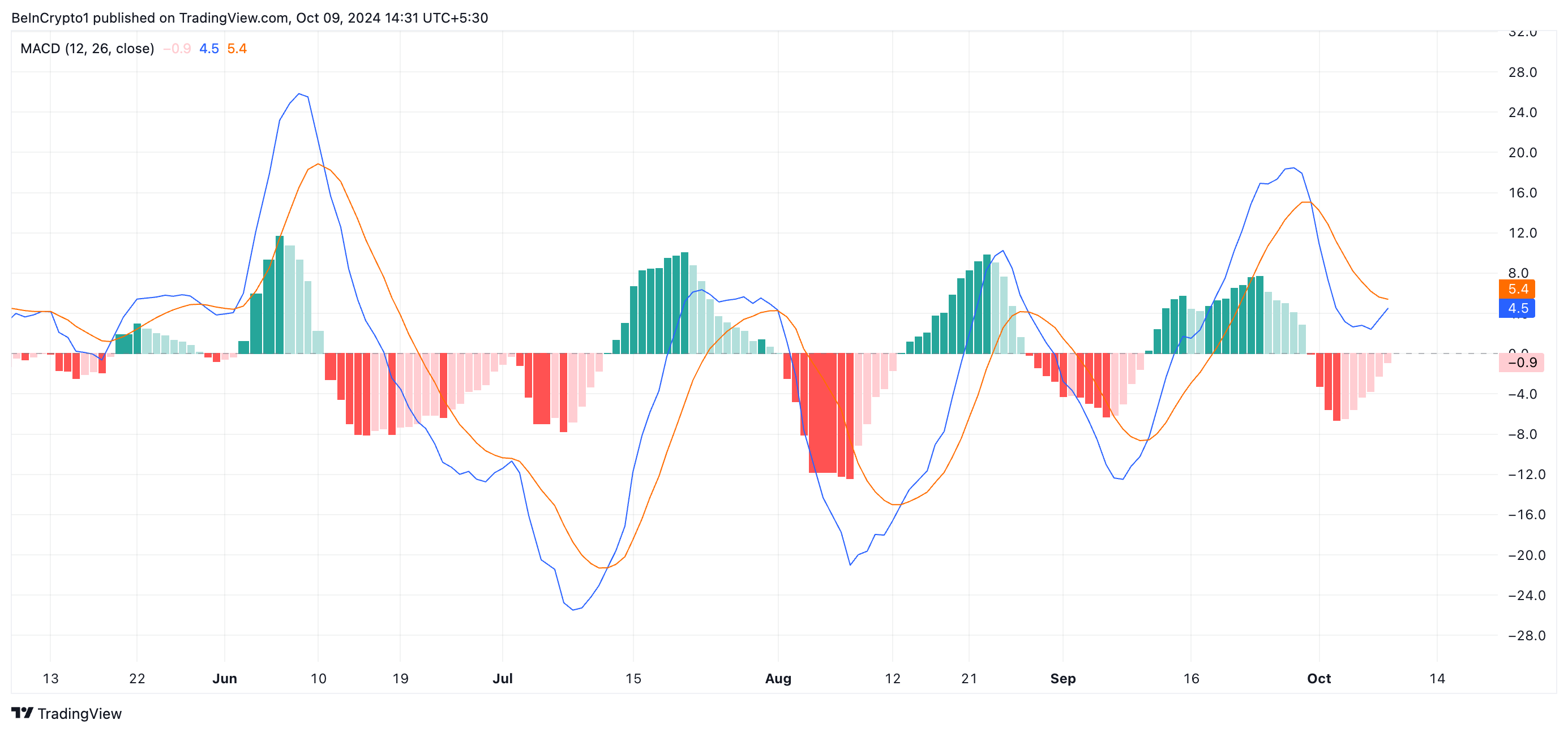 Kun omaisuusvaran MACD, joka seuraa sen trendin suuntaa ja potentiaalisia hintakäännepisteitä, on asetettu tällä tavalla, se viittaa vahvistuvaan ylöspäin suuntautuvaan liikkeeseen, joka vihjaa, että omaisuusvara saattaa olla siirtymässä kestävään härkämäiseen vaiheeseen.