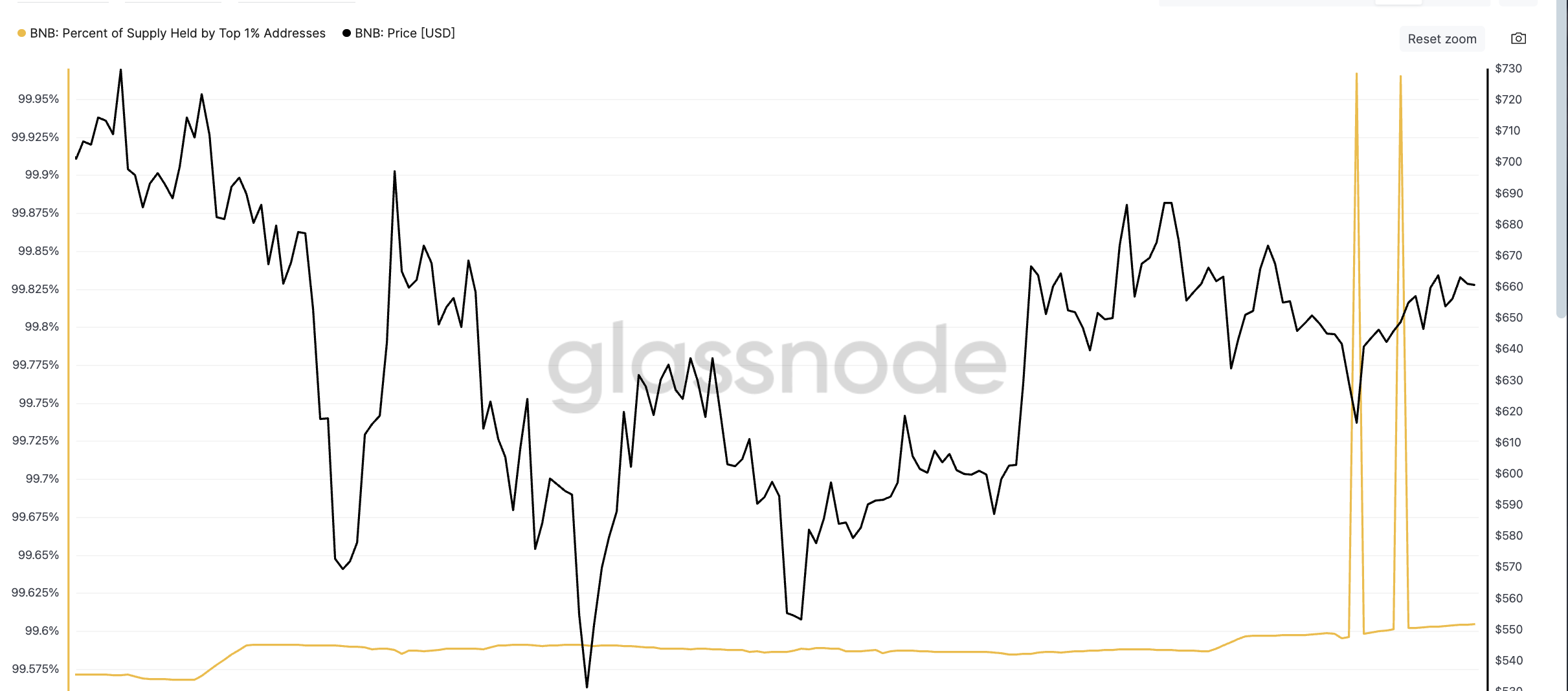 Glassnoden tiedot osoittavat myös jotain, mitä emme ole nähneet koko vuonna: kaksinkertainen piikki BNB:n suurimman 1 %:n osoitteiden hallussa olevan tarjonnan prosenttiosuudessa. Nämä kaksi nousua, 21. kesäkuuta ja 28. kesäkuuta, ovat ainoat merkittävät nousut vuonna 2025.