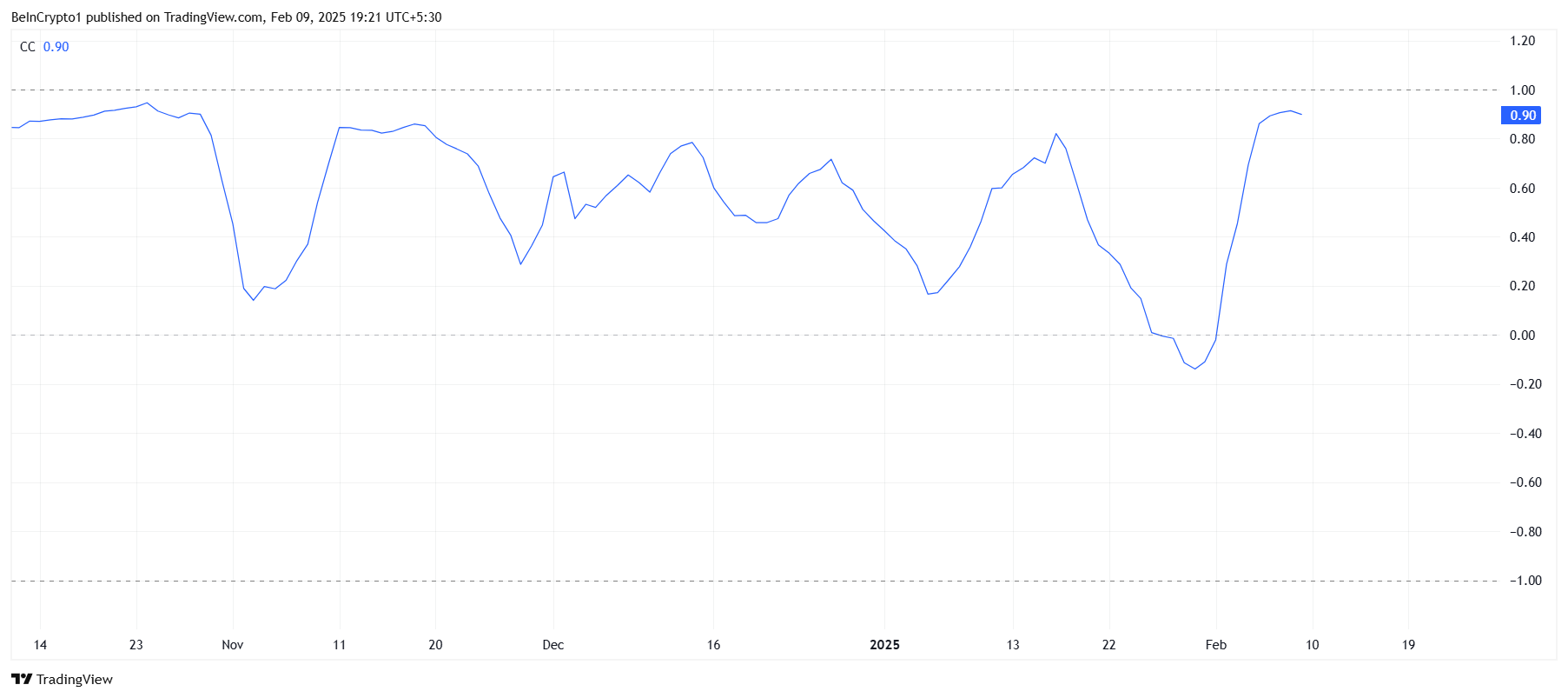 BNB:llä on vahva 0,90 korrelaatio Bitcoiniin, mikä osoittaa, että altcoin liikkuu usein yhdessä kryptokuninkaan kanssa. Koska Bitcoin yrittää palauttaa 100 000 dollarin tukitason, tämä korrelaatio voisi toimia BNB:n eduksi, lisäten sen mahdollisuuksia kestävään hintaralliin.