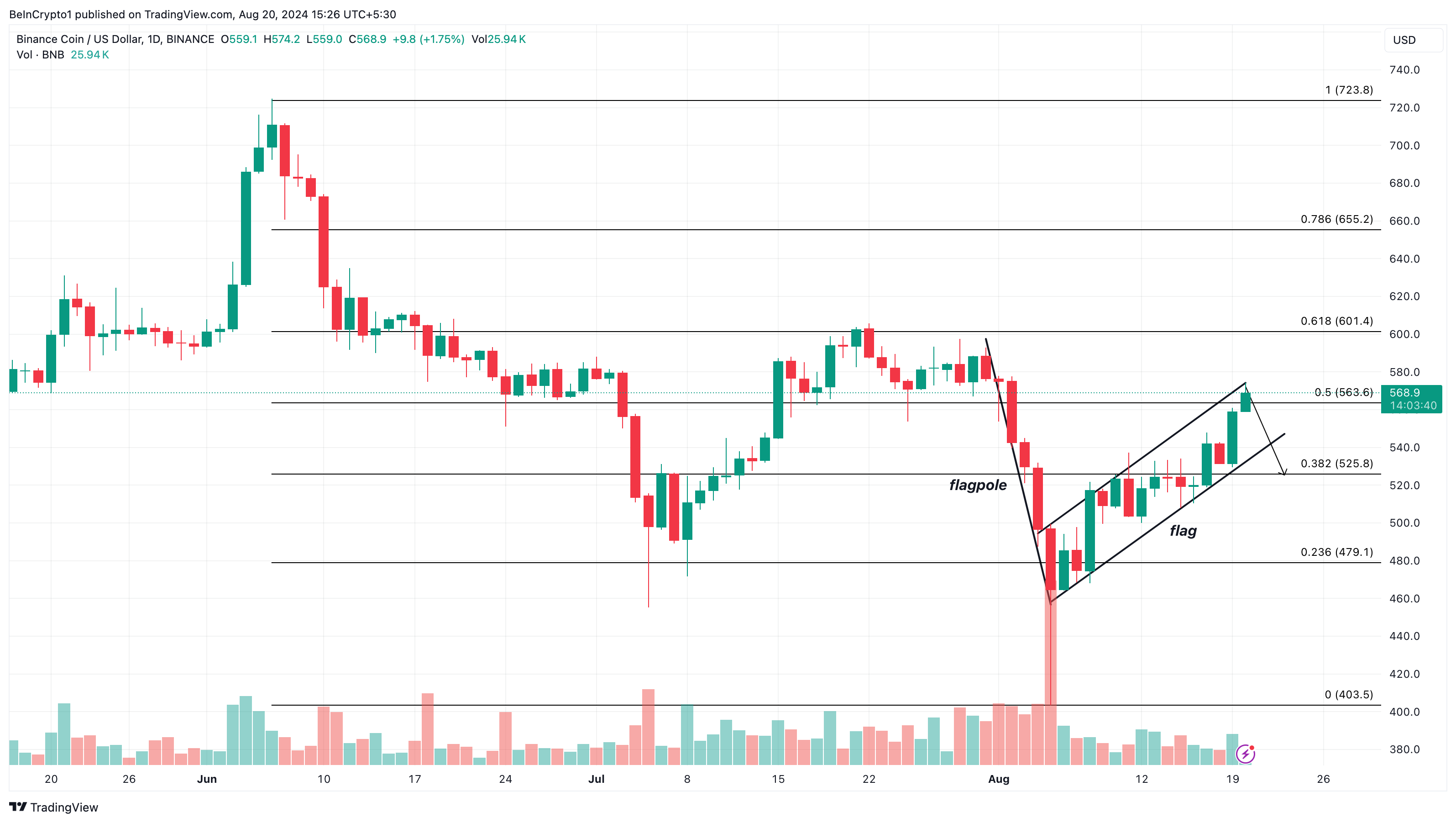 Jos kehitys jatkuu, BNB:n hinta saattaa testata uudelleen 600 dollaria. Tekninen näkökulma kuitenkin kehottaa varovaisuuteen päivittäisen kaavion karhumaisen lipun muodostumisen vuoksi.