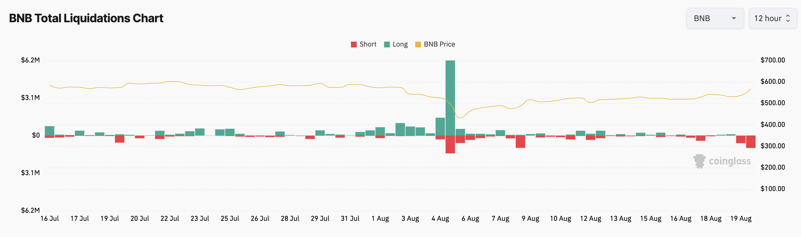 Siksi ei ole paikallaan mainita, että OI:n nousu auttoi BNB:n hinnan nousuun 567 dollariin. Hinnan nousun seurauksena kauppiaat, joilla oli avoimia shorttipositioita, kohtasivat likvidointeja 1,02 miljoonan dollarin edestä viimeisen 24 tunnin aikana.