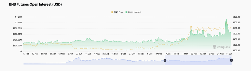 BNB:n hinnan lasku viimeisen kahden viikon aikana on johtanut sen futuurien avoimen koron laskuun. Ketjun tiedot paljastivat, että 8. kesäkuuta altcoinin futuurien avoin korko nousi pilviin vuoden tähän mennessä 1,12 miljardin dollarin huippuun ja on sittemmin laskenut.