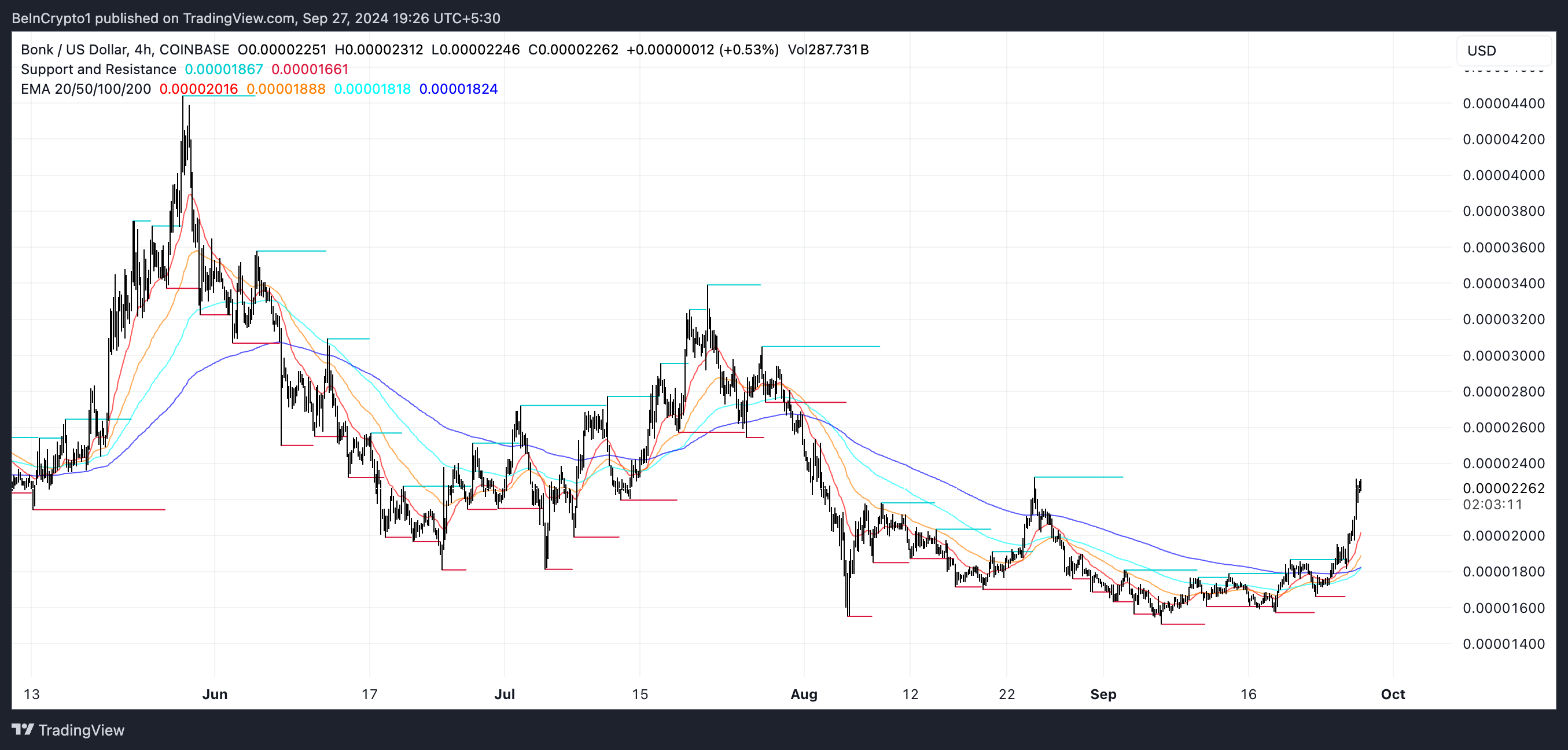 Kolme päivää sitten BONK:n eksponentiaaliset liikkuvat keskiarvot (EMA) muodostivat kultaisen risteymisen — härkämäisen signaalin, jossa lyhyen aikavälin keskiarvo risteää pitkän aikavälin keskiarvon yläpuolelle — johtaen 27 prosentin hinnannousuun. On kuitenkin tärkeää huomata, että viivat eivät ole vielä merkittävästi erillään, mikä on merkittävää, koska se viittaa siihen, että härkämäinen trendi on vielä alkuvaiheessaan eikä ole vielä vakiinnuttanut vahvaa liikehdintää.