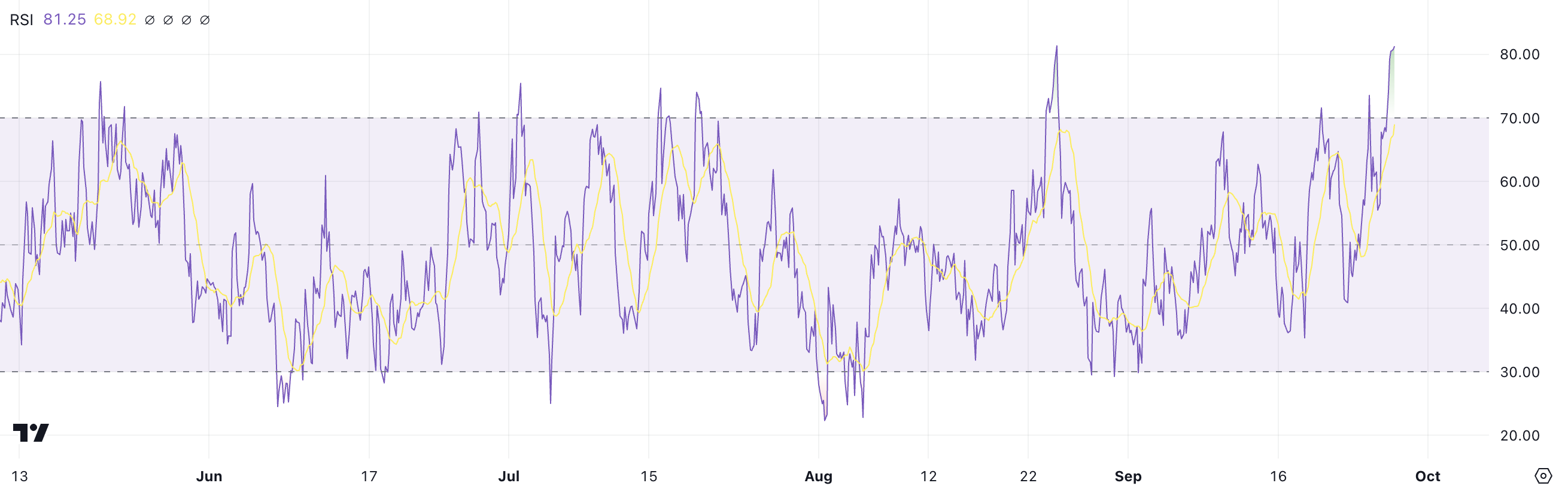 BONK:n suhteellinen voimaindeksi on noussut 81,25:een 22 prosentin hinnannousun jälkeen viimeisen 7 päivän aikana, mikä merkitsee dramaattista muutosta vain kolme päivää sitten, kun sen RSI oli 30. Tämä nopea nousu on merkittävä, koska se heijastaa jyrkkää muutosta markkinatunnelmassa, siirtyen yliostetusta tilasta ylikuormitettuun tilaan lyhyessä ajassa.