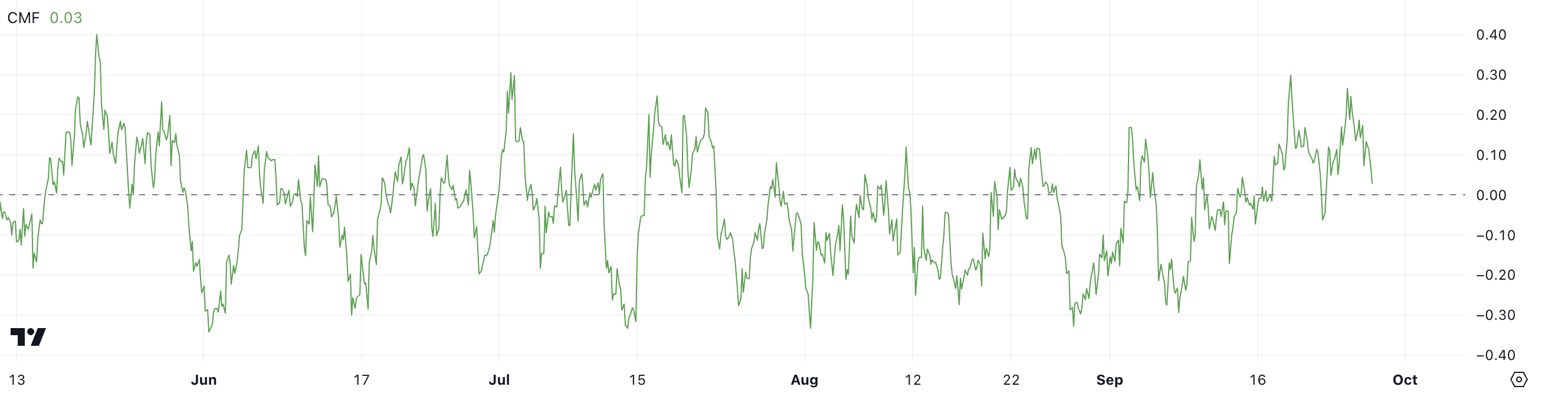BONK:n Chaikin Money Flow (CMF) on laskenut 0,03:een, pudoten lähes 0,30:stä viime viikkoina, mikä osoittaa merkittävää heikkenemistä ostovoimassa. Tämä lasku on merkittävä, koska CMF on volyymipainotteinen tunnusluku, joka mittaa rahan virtausta omaisuusvaraan ja siitä pois, auttaen arvioimaan ostamisen tai myymisen voimakkuutta.