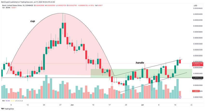 Bonk (BONK), Solana-pohjainen meemikolikko, on yksi parhaista kryptovaluutoista, joiden hinta on viime aikoina noussut huomattavasti. 16. heinäkuuta BONK:n hinta laski 0,000028 dollarista 0,000025 dollariin.