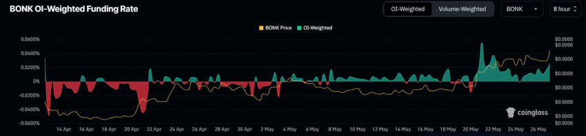 Negatiivinen rahoitusaste viittaa siihen, että lyhyet sopimukset hallitsevat markkinoita, kun taas pitkät sopimukset viittaavat positiivisten sopimusten olevan etusijalla. Näin on BONKin tapauksessa, mikä voisi myös vastata laskevan avoimen koron laskuun.
