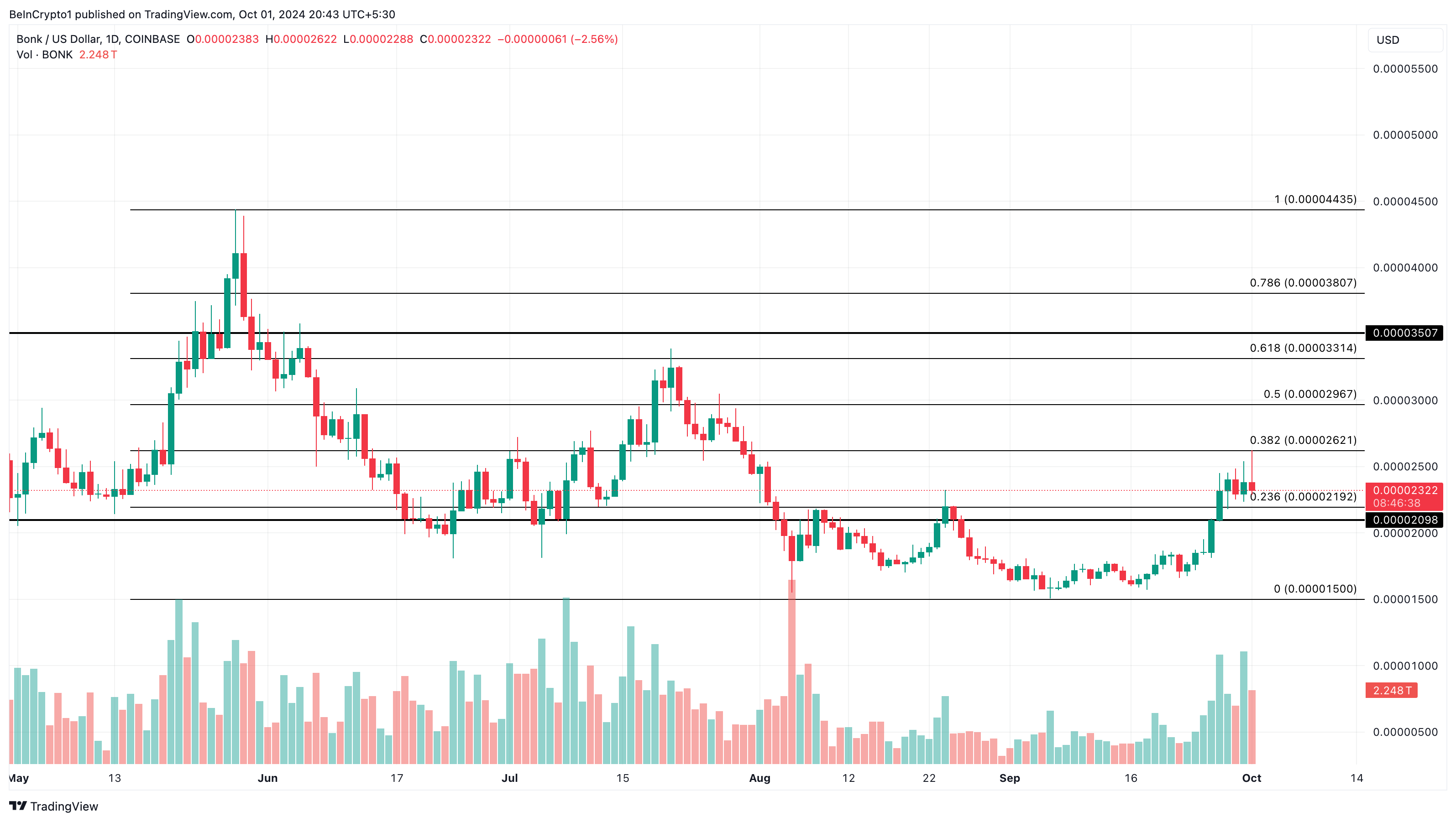 Onnistuessaan BONK:n lyhyen aikavälin tavoite voisi nousta 0,000030 dollariin. Tämä riippuu kuitenkin siitä, voivatko karhut välttää hinnan vetämisen takaisin 0,000021 dollariin.