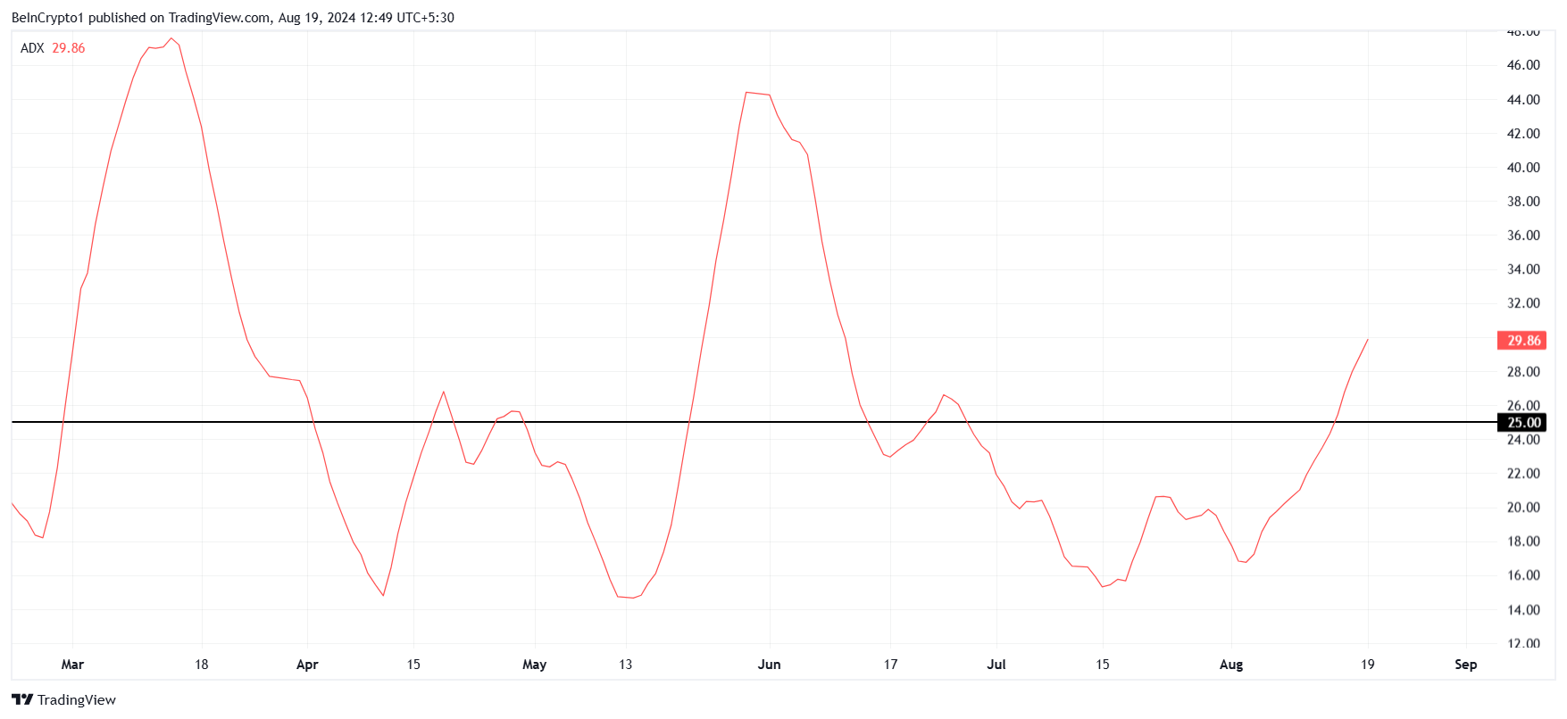 BONK-hinnan laskutrendi näyttää voimistuvan, kuten keskimääräinen suuntausindeksi (ADX) osoittaa. Indikaattori on nyt yli kriittisen 25,0 kynnysarvon. Tämä taso viittaa siihen, että karhumainen trendi saattaa jatkaa hinnan laskua.