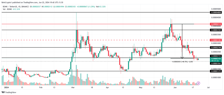 BONK:n hinta, jonka arvo on 0,00002103 dollaria, on kirjoitushetkellä kolmen kuukauden alimmillaan, hieman alle 0,00002153 dollarin tuen. Meemikolikon 48 %:n nosto lähes kuukaudessa voidaan kääntää, jos altcoin nousee takaisin yli 0,00002500 dollarin. Tavoite on kuitenkin korkeampi 0,00002748 dollarissa, mutta se oikeuttaisi BONK:n haltijat jatkamaan nousuaan.