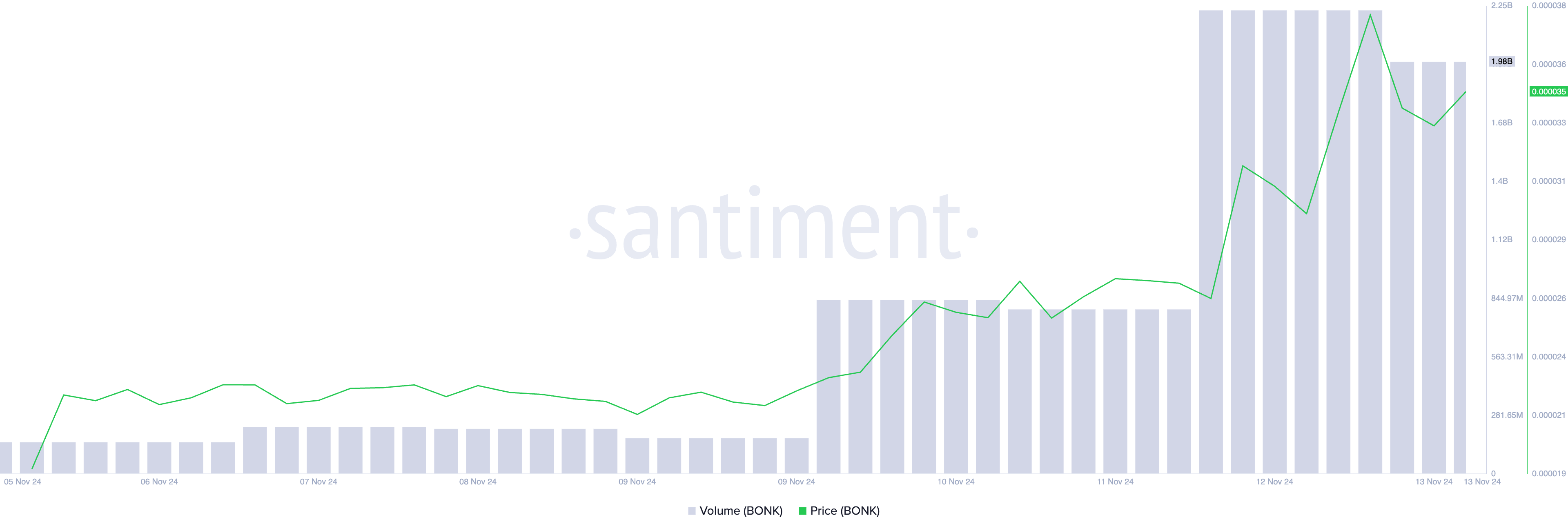 BONK:n hintarallin myötä kaupankäynnin volyymi on merkittävästi kasvanut. Tämä osoittaa vahvaa markkinakiinnostusta ja potentiaalia edelleen nousevalle liikkeelle.
