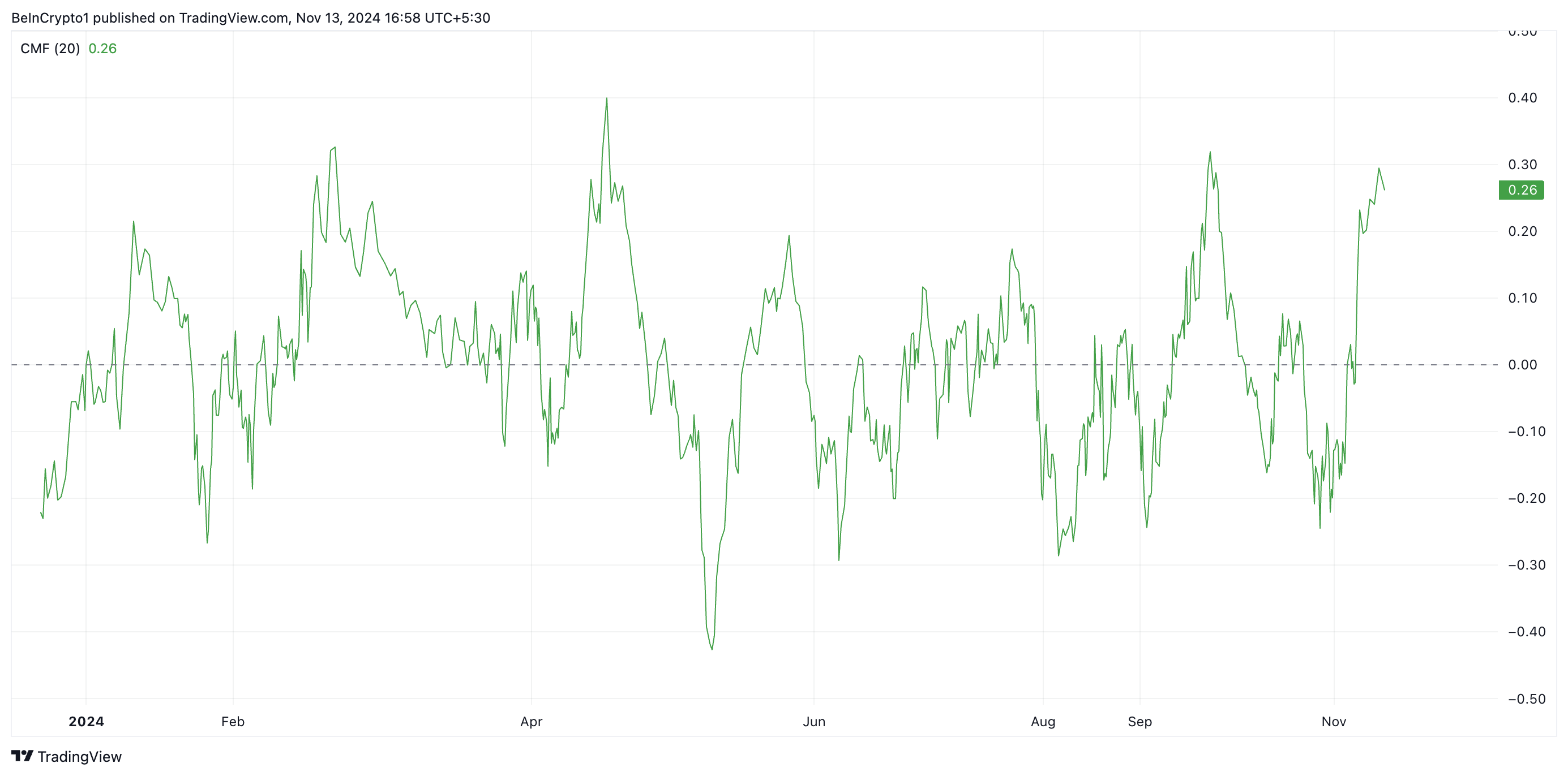 CMF-arvot nollan yläpuolella osoittavat, että ostovoima ylittää myyntivoiman. Se viittaa siihen, että markkinoilla on jatkuvia sijoituksia ja että ne ovat kertymisvaiheessa.