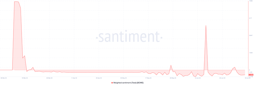BOMEn mainintoja sosiaalisen median alustoilla vaivaavat tällä hetkellä negatiiviset tunteet. Tämä perustuu sen painotetun sentimentin lukemiin, jotka ovat -0,53 tätä kirjoitettaessa.