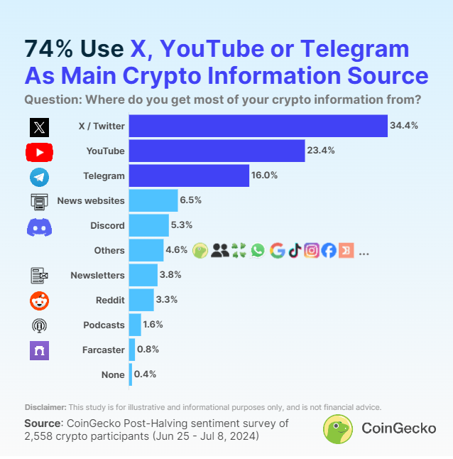 Lisäksi tämä päätös saattaa vaikuttaa maan kryptovaluuttayhteisöön. CoinGeckon äskettäisen kyselyn mukaan 34,4% kryptovaluuttakauppiaista ja -sijoittajista luottaa X:ään tietolähteenään. Erityisesti 66,7% 1 065 kyselyyn osallistuneesta nimesi X:n ensisijaiseksi kryptovaluuttatiedon lähteekseen.