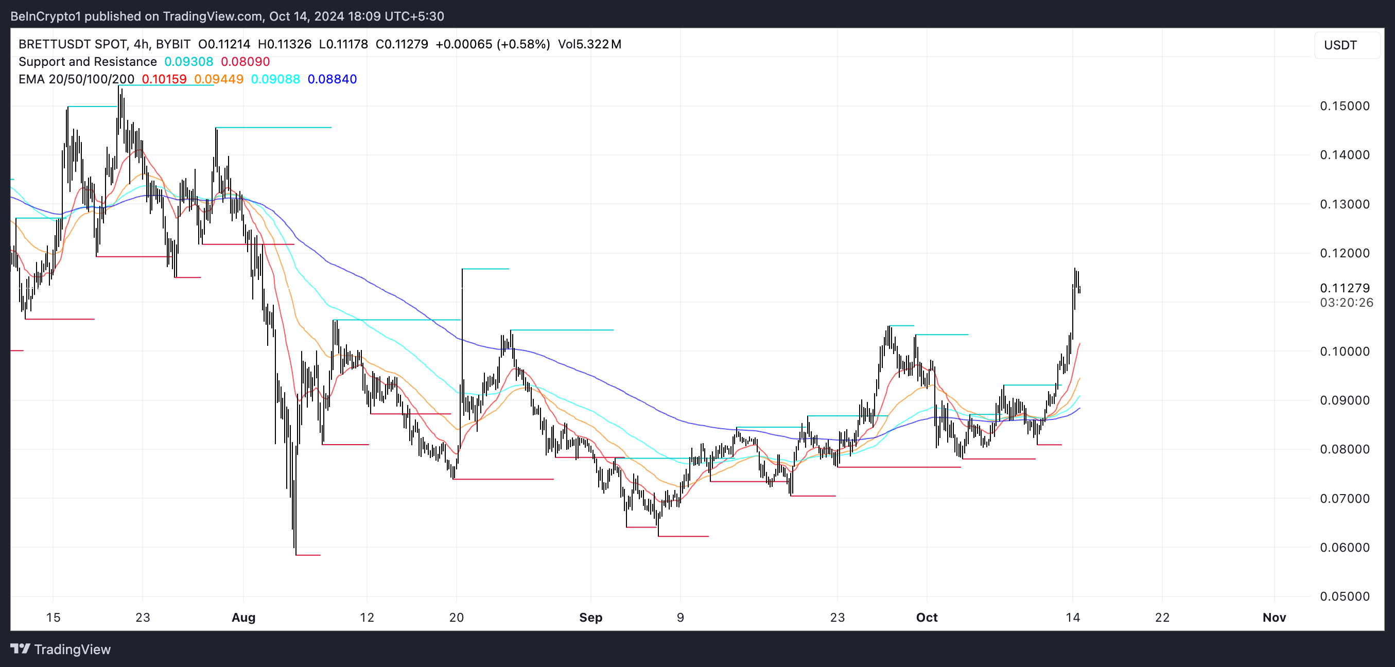BRETTin EMA-viivat osoittavat tällä hetkellä vahvaa nousutrendiä, mikä korostaa härkämäistä tunnelmaa markkinoilla. Lokakuun 11. päivänä BRETT koki merkittävän teknisen tapahtuman, jota kutsutaan “kultaiseksi risteämiseksi”, jossa sen lyhyen aikavälin EMA (Exponential Moving Average) ylitti sen pitkän aikavälin EMA:n.