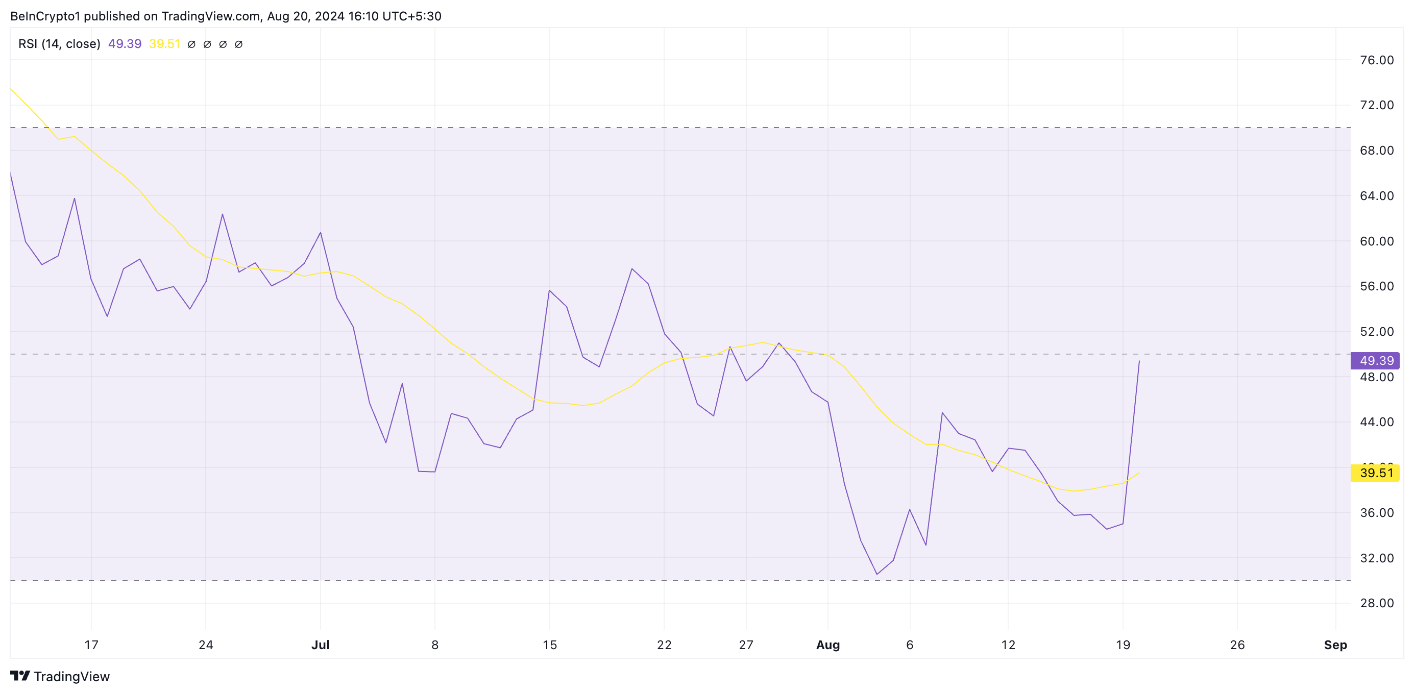 Lisäksi vahvistaen BRETTin kysynnän kasvua, sen suhteellinen vahvuusindeksi (RSI) on nousemassa ja on lähellä rikkoa neutraalin 50 viivan yläpuolelle. Tätä kirjoitettaessa RSI on 49,39, mikä osoittaa kasvavaa härkämäistä momenttia.
