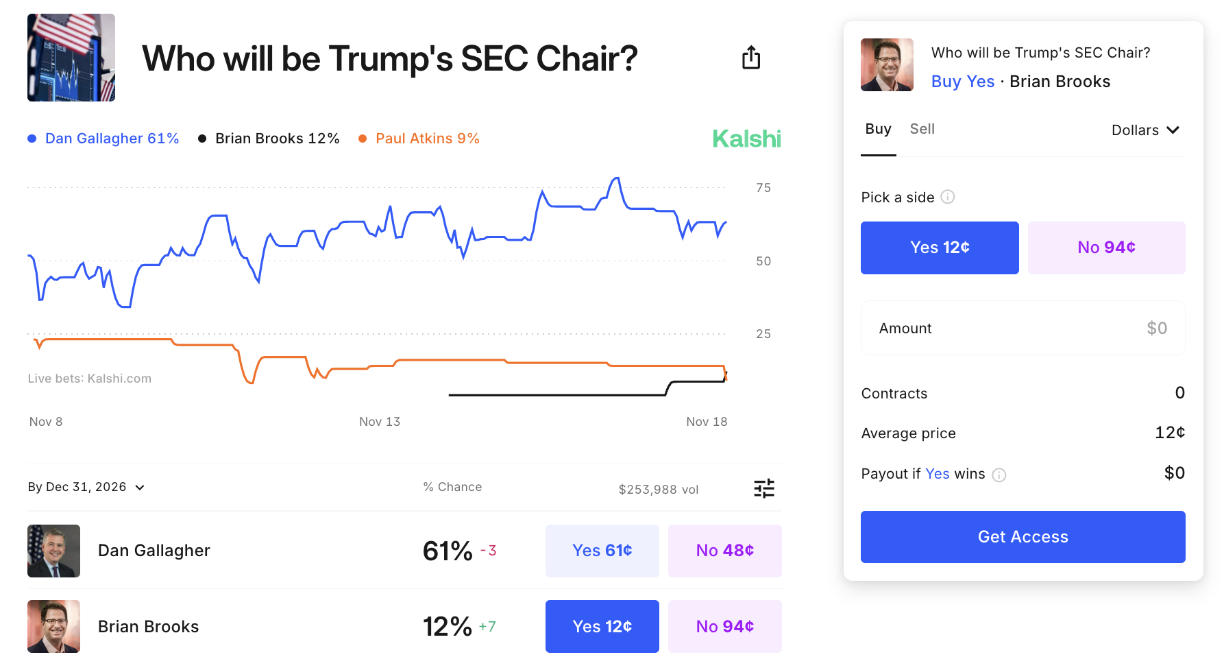 Tämän ilmoituksen jälkeen amerikkalaisen rahoitusalan Kalshi asetti Brooksin toiseksi seuraavan SEC:n puheenjohtajan paikalle.