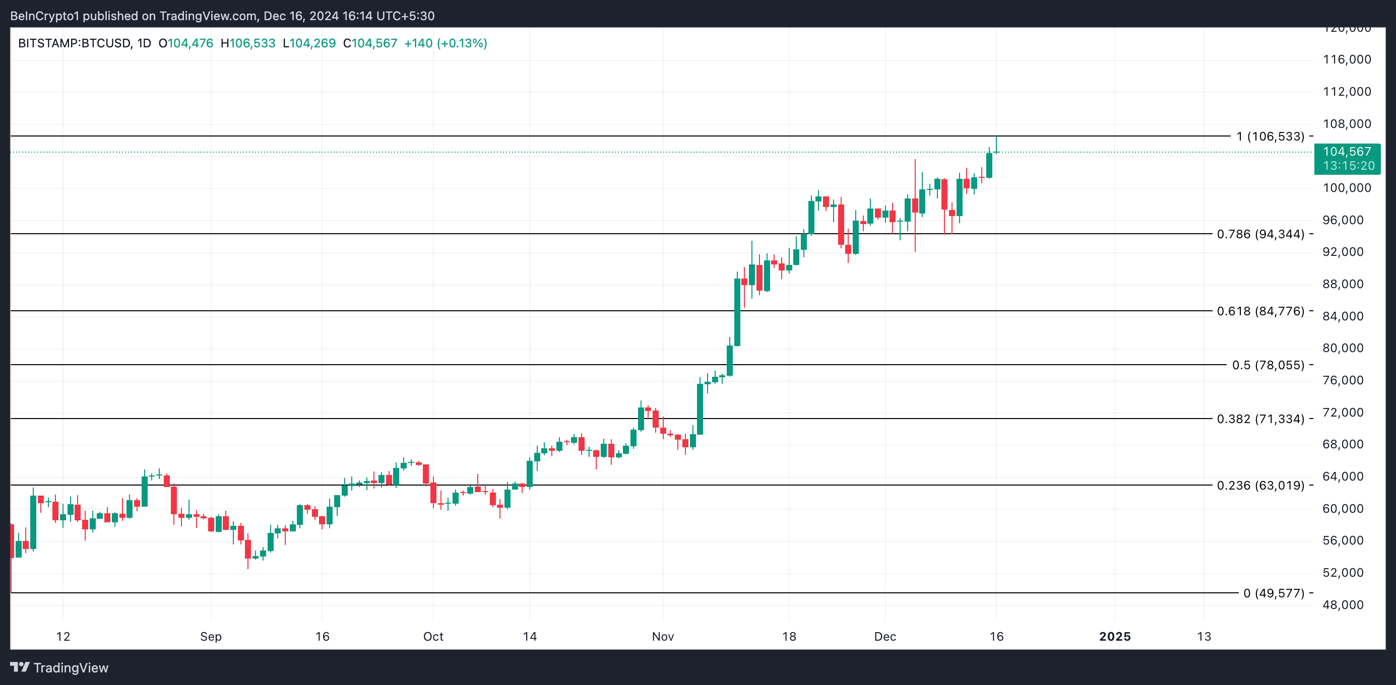 Kirjoitushetkellä BTC:n hinta on 104 567 dollaria, juuri alle uuden vastustason, joka on sen viimeisin hintahuippu 106 533 dollaria. Jos BTC-valaat tehostavat keräystoimiaan, kolikon hinta saavuttaa tämän huipun uudelleen ja nousee kohti uutta huippua.