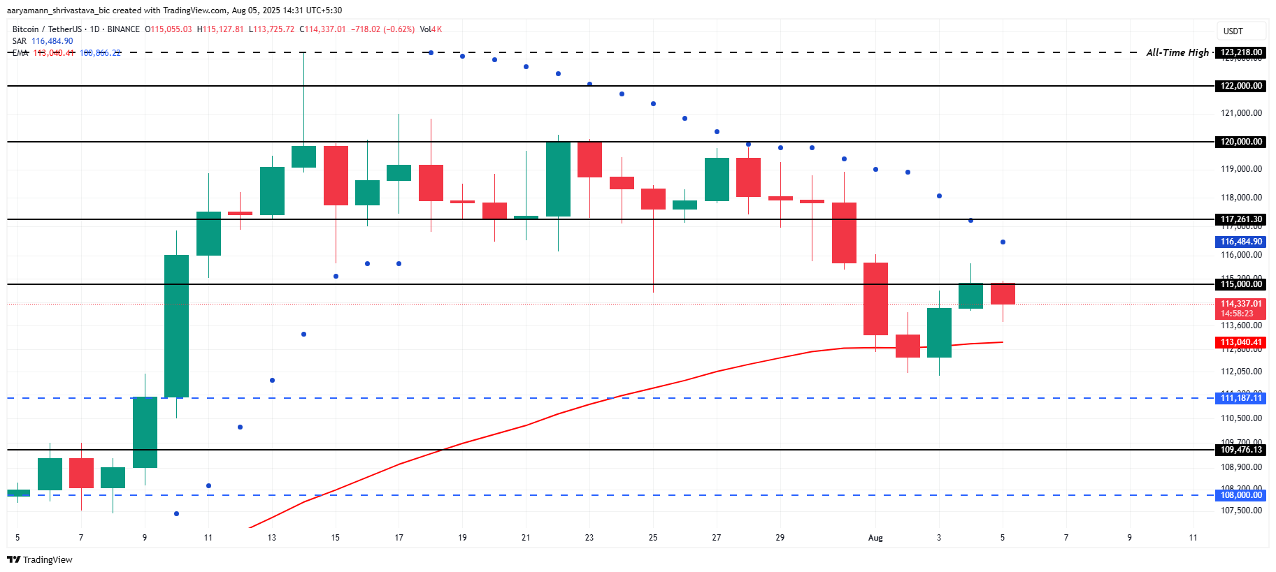 Bitcoinin hinta on tällä hetkellä 114 337 dollaria, ja se kohtaa laskupainetta. Parabolic SAR on kynttilöiden yläpuolella, mikä viittaa laskevaan suuntaukseen. Kuitenkin 50 päivän eksponentiaalinen liukuva keskiarvo (EMA) pitää edelleen vahvana tukena, mikä osoittaa, että laajempi markkinatunnelma ei ole täysin negatiivinen. Bitcoin saattaa jatkaa konsolidoitumista, löytäen vakautta 110 000 dollarin tason yläpuolella.